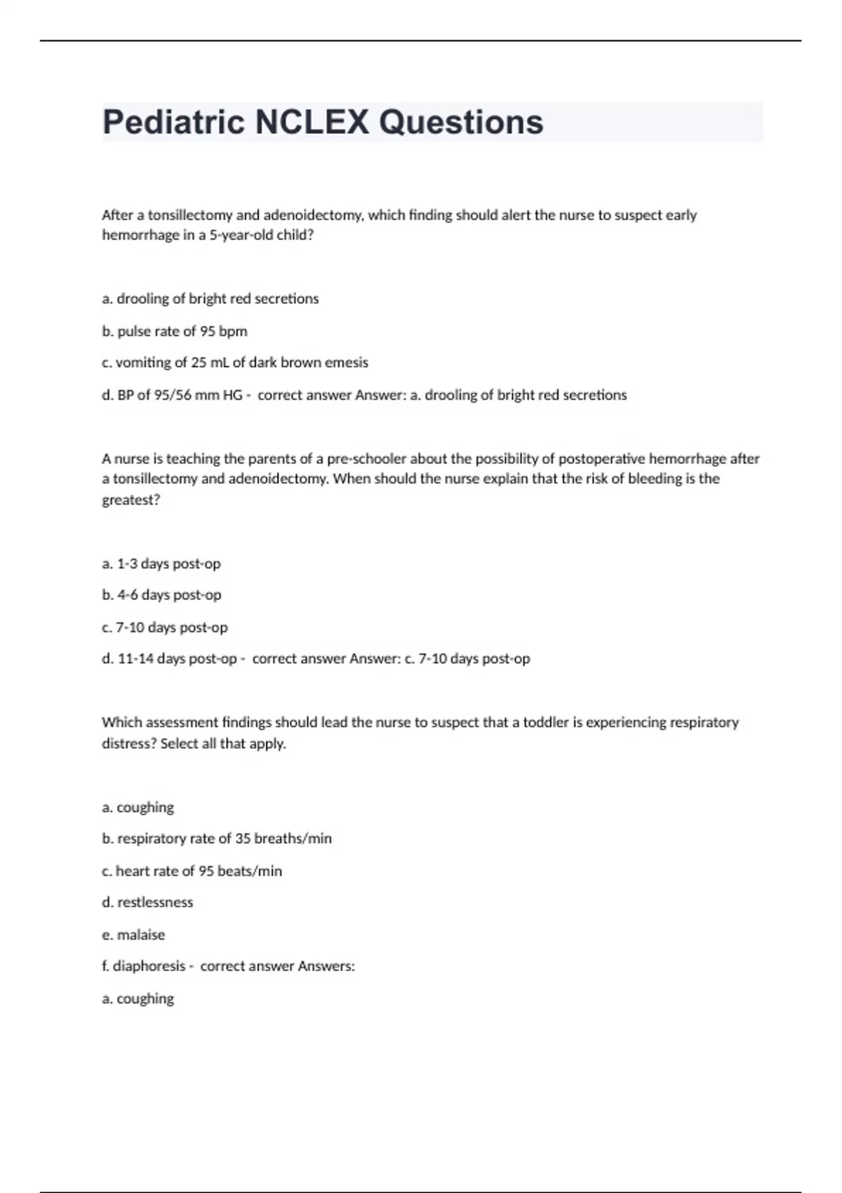 Pediatric NCLEX QuestionsAfter a tonsillectomy and adenoidectomy, which finding should alert the nurse to suspect early hemorrhage in a 5-year-old child? a. drooling of bright red secretions b. pulse rate of 95 bpm c. vomiting of 25 mL of dark brown emesis d. BP of 95/56 mm HG - correct answer Answer: a. drooling of bright red secretions A nurse is teaching the parents of a pre-schooler about the possibility of postoperative hemorrhage after a tonsillectomy and adenoidectomy. When should the nurse explain that the risk of bleeding is the greatest? a. 1-3 days post-op b. 4-6 days post-op c. 7-10 days post-op d. 11-14 days post-op - correct answer Answer: c. 7-10 days post-op Which assessment findings should lead the nurse to suspect that a toddler is experiencing respiratory distress? Select all that apply. a. coughing b. respiratory rate of 35 breaths/min c. heart rate of 95 beats/min d. restlessness e. malaise f. diaphoresis - correct answer Answers: a. coughing
