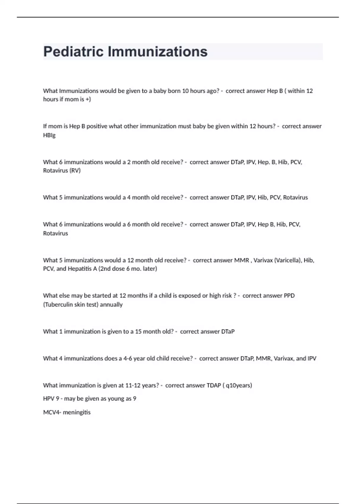 Pediatric ImmunizationsWhat Immunizations would be given to a baby born 10 hours ago? - correct answer Hep B ( within 12 hours if mom is +) If mom is Hep B positive what other immunization must baby be given within 12 hours? - correct answer HBIg What 6 immunizations would a 2 month old receive? - correct answer DTaP, IPV, Hep. B, Hib, PCV, Rotavirus (RV) What 5 immunizations would a 4 month old receive? - correct answer DTaP, IPV, Hib, PCV, Rotavirus What 6 immunizations would a 6 month old receive? - correct answer DTaP, IPV, Hep B, Hib, PCV, Rotavirus What 5 immunizations would a 12 month old receive? - correct answer MMR , Varivax (Varicella), Hib, PCV, and Hepatitis A (2nd dose 6 mo. later) What else may be started at 12 months if a child is exposed or high risk ? - correct answer PPD (Tuberculin skin test) annually What 1 immunization is given to a 15 month old? - correct answer DTaP What 4 immunizations does a 4-6 year old child receive? - correct answer DTaP, MMR, Varivax, and IPV What immunization is given at 11-12 years? - correct answer TDAP ( q10years) HPV 9 - may be given as young as 9 MCV4- meningitis If a child has an injury what is the time frame for the TDAP vaccine