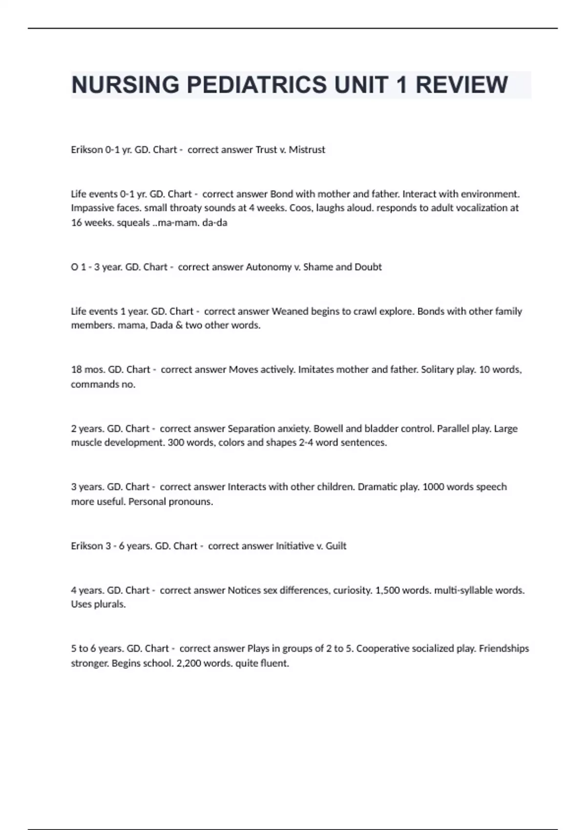 NURSING PEDIATRICS UNIT 1 REVIEWErikson 0-1 yr. GD. Chart - correct answer Trust v. Mistrust Life events 0-1 yr. GD. Chart - correct answer Bond with mother and father. Interact with environment. Impassive faces. small throaty sounds at 4 weeks. Coos, laughs aloud. responds to adult vocalization at 16 weeks. squeals ..ma-mam. da-da O 1 - 3 year. GD. Chart - correct answer Autonomy v. Shame and Doubt Life events 1 year. GD. Chart - correct answer Weaned begins to crawl explore. Bonds with other family members. mama, Dada & two other words. 18 mos. GD. Chart - correct answer Moves actively. Imitates mother and father. Solitary play. 10 words, commands no. 2 years. GD. Chart - correct answer Separation anxiety. Bowell and bladder control. Parallel play. Large muscle development. 300 words, colors and shapes 2-4 word sentences. 3 years. GD. Chart - correct answer Interacts with other children. Dramatic play. 1000 words speech more useful. Personal pronouns. Erikson 3 - 6 years. GD. Chart - correct answer Initiative v. Guilt 4 years. GD. Chart - correct answer Notices sex differences, curiosity. 1,500 words. multi-syllable words. Uses plurals. 5 to 6 years. GD. Chart - correct answer Plays in groups of 2 to 5. Cooperative socialized play. Friendships stronger. Begins school. 2,200 words. quite fluent.