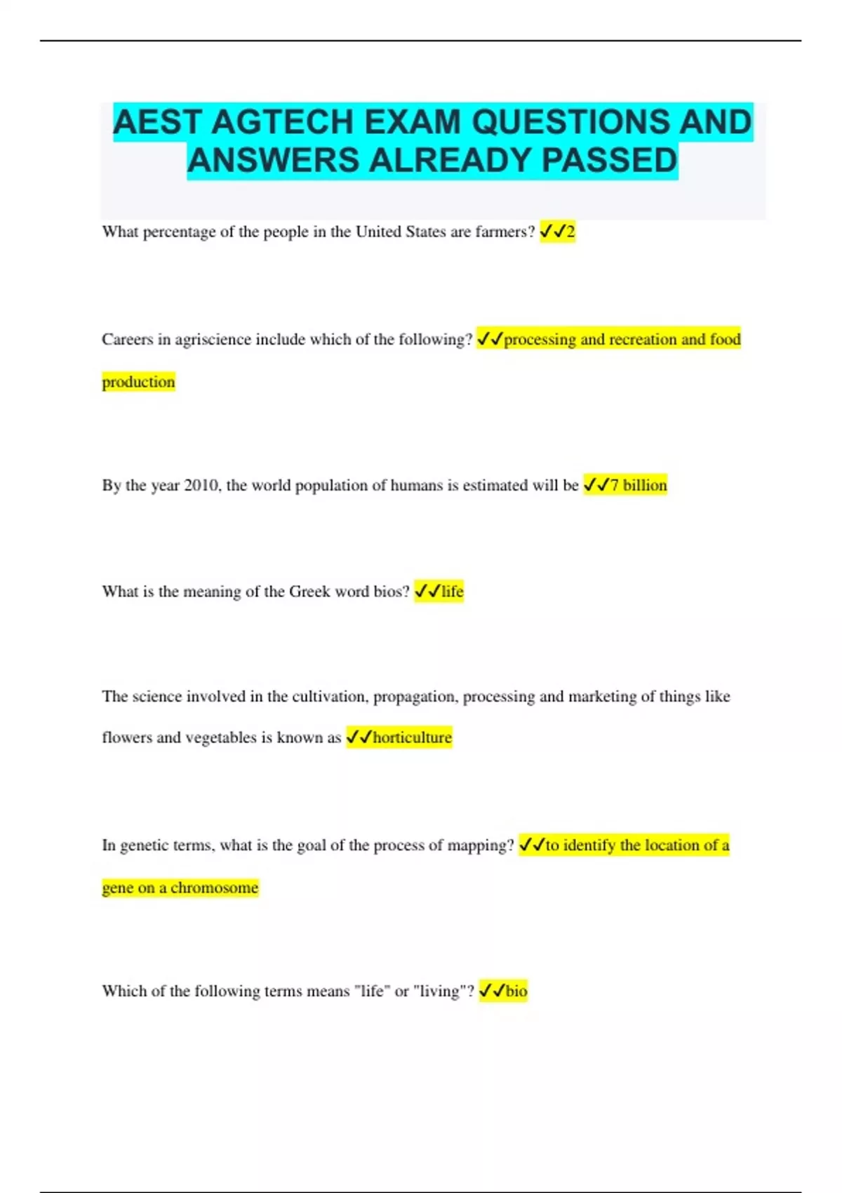 AEST AGTECH EXAM QUESTIONS AND ANSWERS ALREADY PASSED What percentage of the people in the United States are farmers? 2 Careers in agriscience include which of the following? processing and recreation and food production By the year 2010, the world population of humans is estimated will be 7 billion What is the meaning of the Greek word bios? life The science involved in the cultivation, propagation, processing and marketing of things like flowers and vegetables is known as horticulture In genetic terms, what is the goal of the process of mapping? to identify the location of a gene on a chromosome Which of the following terms means "life" or "living"? bio Gregor Johann Mendel discovered the effects of genetics on characteristics using which of the following types of plant? pea The pale yellow element occurring widely in nature is sulfur Which of the following is a colorless, radioactive gas formed by the disintegration of radium? radon Chlorofluorocarbons are a group of compounds consisting of which of the following? chlorine, fluorine, carbon, and hydrogen Plants give off oxygen through the process known as: photosynthesis Careers in air quality are available with which service? weather What is the most abundant element in air? nitrogen Insects and other organisms have adapted to the pollution in the air through a process known as: natural selection The greenhouse effect and global warming are: controversial The material that remains after a plant dies or is harvested is called: plant residue The bodies of young plants and animals consist of about 90 percent of which of the following? water A universal solvent serves to: dissolve or change most other materials Which term describes drinking water that is free of harmful chemicals? potable The water cycle is a natural process by which water moves in a circular motion from: oceans to land and back to oceans Which type of water adheres so tightly that plants cannot use it? hygroscopic Which of the following is not an area of focus by the USDA to prevent contamination of groundwater by crop pesticides? management of local water sewage systems The addition of water to plants to supplement the water provided by rain or snow is called: irrigation The attempt to alter the crop environment to prevent or reduce pest damage is known as _____ control. cultural A pest's ability to repopulate after control has been eliminated or reduced is called: pest resurgence It generally takes how long for the release of sterile insects to completely eradicate harmful insects? 2 or 3 years _____ is the union of the pollen and the stigma. Pollination In plant breeding, what is removed