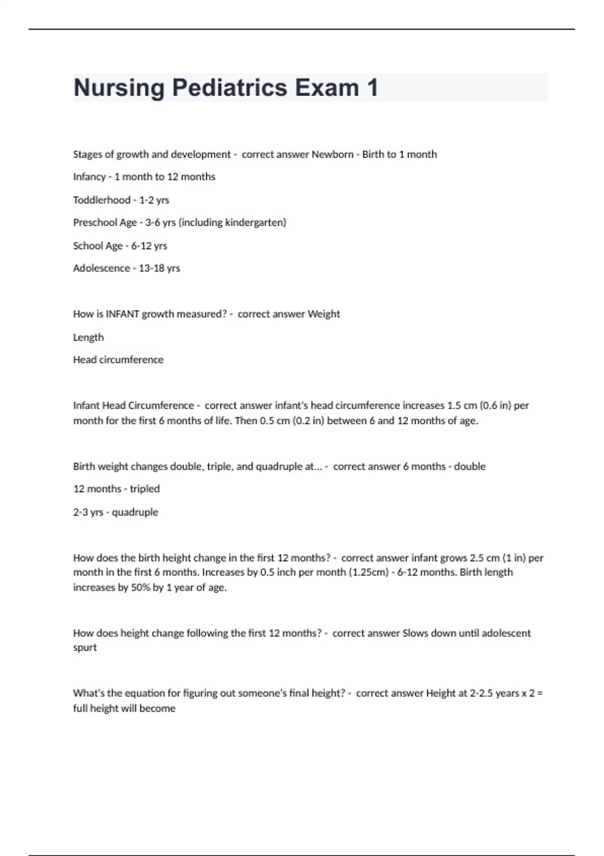 Nursing Pediatrics Exam 1Stages of growth and development - correct answer Newborn - Birth to 1 month Infancy - 1 month to 12 months Toddlerhood - 1-2 yrs Preschool Age - 3-6 yrs (including kindergarten) School Age - 6-12 yrs Adolescence - 13-18 yrs How is INFANT growth measured? - correct answer Weight Length Head circumference Infant Head Circumference - correct answer infant's head circumference increases 1.5 cm (0.6 in) per month for the first 6 months of life. Then 0.5 cm (0.2 in) between 6 and 12 months of age. Birth weight changes double, triple, and quadruple at... - correct answer 6 months - double 12 months - tripled 2-3 yrs - quadruple How does the birth height change in the first 12 months? - correct answer infant grows 2.5 cm (1 in) per month in the first 6 months. Increases by 0.5 inch per month (1.25cm) - 6-12 months. Birth length increases by 50% by 1 year of age. How does height change following the first 12 months? - correct answer Slows down until adolescent spurt What's the equation for figuring out someone's final height? - correct answer Height at 2-2.5 years x 2 = full height will become