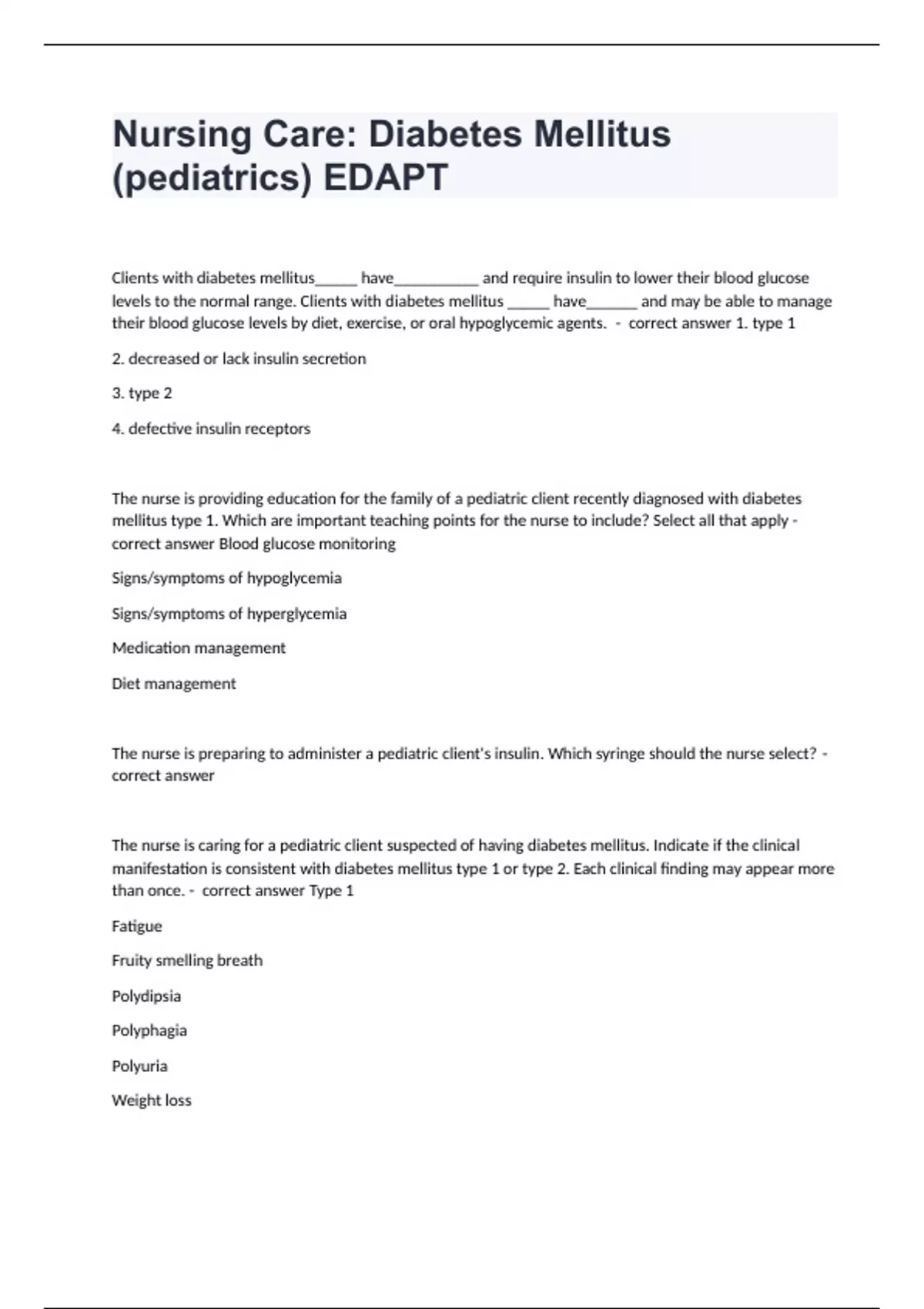 Nursing Care: Diabetes Mellitus (pediatrics) EDAPT 2023/2024 passed