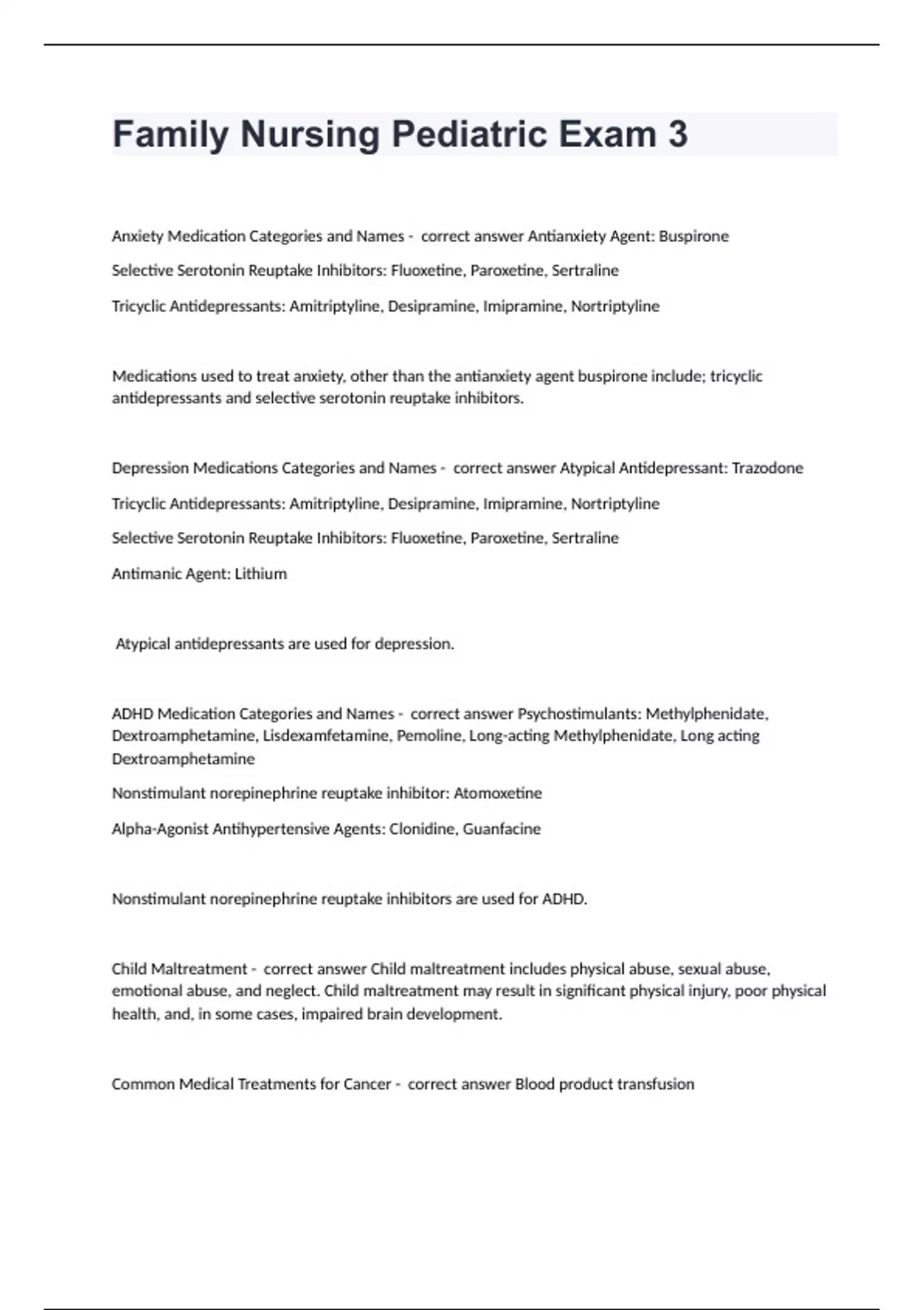 Family Nursing Pediatric Exam 3 Anxiety Medication Categories and Names - correct answer Antianxiety Agent: Buspirone Selective Serotonin Reuptake Inhibitors: Fluoxetine, Paroxetine, Sertraline Tricyclic Antidepressants: Amitriptyline, Desipramine, Imipramine, Nortriptyline Medications used to treat anxiety, other than the antianxiety agent buspirone include; tricyclic antidepressants and selective serotonin reuptake inhibitors. Depression Medications Categories and Names - correct answer Atypical Antidepressant: Trazodone Tricyclic Antidepressants: Amitriptyline, Desipramine, Imipramine, Nortriptyline Selective Serotonin Reuptake Inhibitors: Fluoxetine, Paroxetine, Sertraline Antimanic Agent: Lithium Atypical antidepressants are used for depression. ADHD Medication Categories and Names - correct answer Psychostimulants: Methylphenidate, Dextroamphetamine, Lisdexamfetamine, Pemoline, Long-acting Methylphenidate, Long acting Dextroamphetamine Nonstimulant norepinephrine reuptake inhibitor: Atomoxetine Alpha-Agonist Antihypertensive Agents: Clonidine, Guanfacine Nonstimulant norepinephrine reuptake inhibitors are used for ADHD. Child Maltreatment - correct answer Child maltreatment includes physical abuse, sexual abuse, emotional abuse, and neglect. Child maltreatment may result in significant physical injury, poor physical health, and, in some cases, impaired brain development. Common Medical Treatments for Cancer - correct answer Blood product transfusion