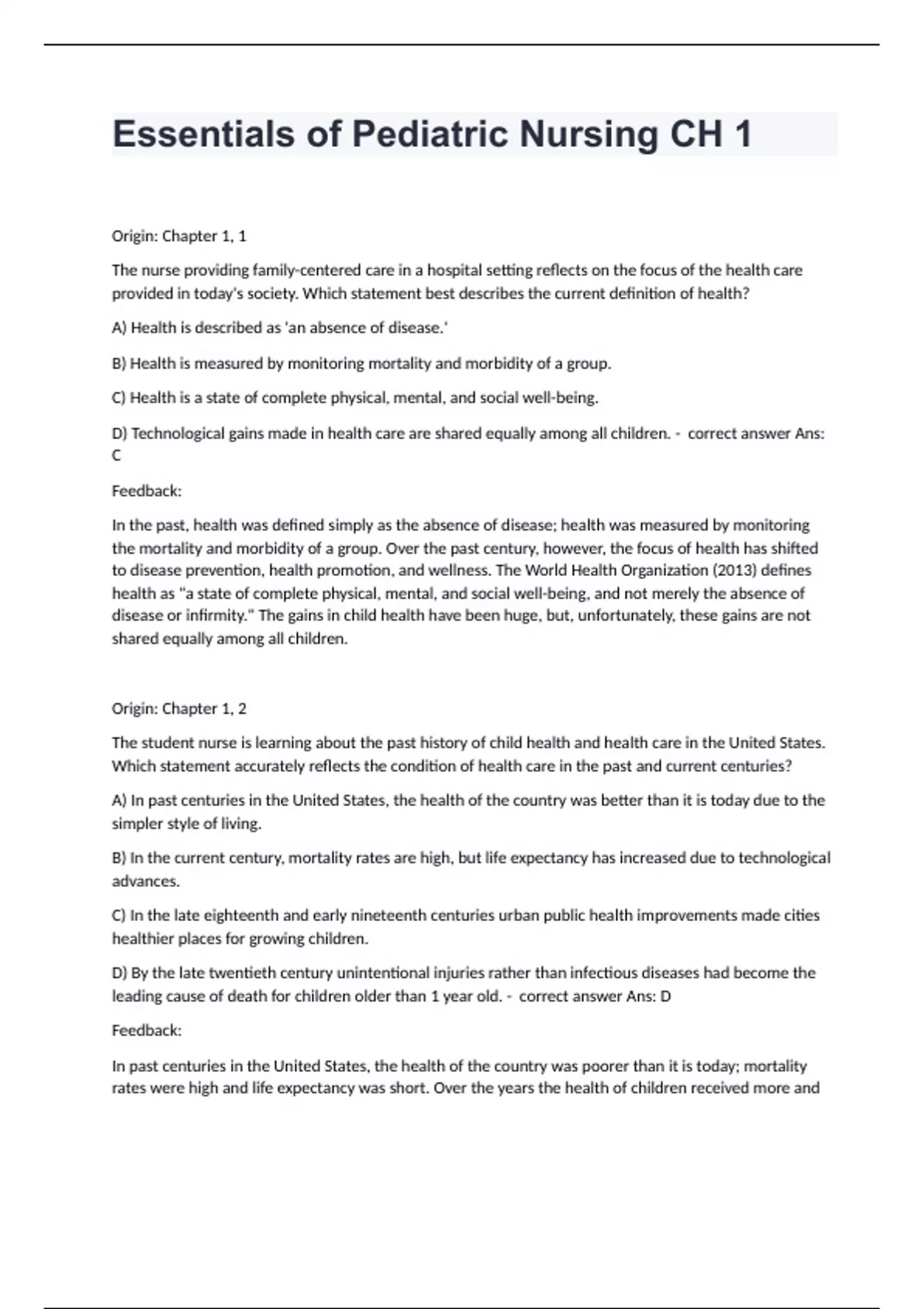 Essentials of Pediatric Nursing CH 1Origin: Chapter 1, 1 The nurse providing family-centered care in a hospital setting reflects on the focus of the health care provided in today's society. Which statement best describes the current definition of health? A) Health is described as 'an absence of disease.' B) Health is measured by monitoring mortality and morbidity of a group. C) Health is a state of complete physical, mental, and social well-being. D) Technological gains made in health care are shared equally among all children. - correct answer Ans: C Feedback: In the past, health was defined simply as the absence of disease; health was measured by monitoring the mortality and morbidity of a group. Over the past century, however, the focus of health has shifted to disease prevention, health promotion, and wellness. The World Health Organization (2013) defines health as "a state of complete physical, mental, and social well-being, and not merely the absence of disease or infirmity." The gains in child health have been huge, but, unfortunately, these gains are not shared equally among all children. Origin: Chapter 1, 2 The student nurse is learning about the past history of child health and health care in the United States. Which statement accurately reflects the condition of health care in the past and current centuries? A) In past centuries in the United States, the health of the country was better than it is today due to the simpler style of living. B) In the current century, mortality rates are high, but life expectancy has increased due to technological advances. C) In the late eighteenth and early nineteenth centuries urban public health improvements made cities healthier places for growing children. D) By the late twentieth century unintentional injuries rather than infectious diseases had become the leading cause of death for children older than 1 year old. - correct answer Ans: D Feedback: In past centuries in the United States, the health of the country was poorer than it is today; mortality rates were high and life expectancy was short. Over the years the health of children received more and more attention, leading to a better understanding of sources of illness and improvements in sanitation, water, and nutrition. As a result, by the late twentieth century unintentional injuries rather than infectious diseases had become the leading cause of death for children older than 1 year old. Origin: Chapter 1, 3 The nurse is administering a number of therapeutic interventions for neonates, infants, and children on the pediatric unit. Which intervention contributes to an increase in chronic illness seen in early childhood? A) Administering antibiotics to prevent lethal infections B) Vaccinating children to prevent childhood diseases C) Using mechanical ventilation for premature infants D) Using corticosteroids as a treatment for asthma - correct answer Ans: C Feedback: Using mechanical ventilation and medications to foster lung development in premature infants increases their survival rate. Yet the infants who survive are often faced with myriad chronic illnesses. Administering antibiotics to prevent lethal infections, vaccinating children to prevent childhood diseases, and using corticosteroids as a treatment for asthma may cause side effects, but do not contribute to chronic illness in children. Origin: Chapter 1, 4 The nurse is reviewing a copy of the U.S. Surgeon General's Report, Healthy People. Which nursing action best reflects the nurse fostering this health care agenda? A) The nurse signs up for classes to obtain an advanced degree in nursing B) The nurse volunteers at a local health care clinic providing free vaccinations for low-income populations C) The nurse performs an in-service on basic hospital equipment for student nurses D) The nurse compiles nursing articles on evidence-based practices in nursing to present at a hospital training seminar - correct answer Ans: B Feedback: Healthy People is a comprehensive health promotion and disease prevention agenda that is working toward improving the quantity and quality of life for all Americans (U.S. Department of Health and Human Services, 2010). Overarching goals are to eliminate preventable disease, disability, injury, and premature death; achieve health equity, eliminate disparities, and improve the health of all groups; create physical and social environments that promote good health; and promote healthy development
