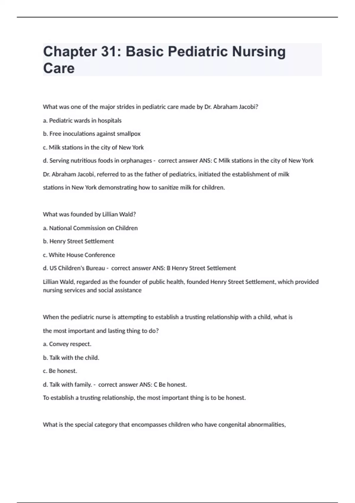 Chapter 31: Basic Pediatric Nursing Care What was one of the major strides in pediatric care made by Dr. Abraham Jacobi? a. Pediatric wards in hospitals b. Free inoculations against smallpox c. Milk stations in the city of New York d. Serving nutritious foods in orphanages - correct answer ANS: C Milk stations in the city of New York Dr. Abraham Jacobi, referred to as the father of pediatrics, initiated the establishment of milk stations in New York demonstrating how to sanitize milk for children. What was founded by Lillian Wald? a. National Commission on Children b. Henry Street Settlement c. White House Conference d. US Children's Bureau - correct answer ANS: B Henry Street Settlement Lillian Wald, regarded as the founder of public health, founded Henry Street Settlement, which provided nursing services and social assistance When the pediatric nurse is attempting to establish a trusting relationship with a child, what is the most important and lasting thing to do? a. Convey respect. b. Talk with the child. c. Be honest. d. Talk with family. - correct answer ANS: C Be honest. To establish a trusting relationship, the most important thing is to be honest. What is the special category that encompasses children who have congenital abnormalities,