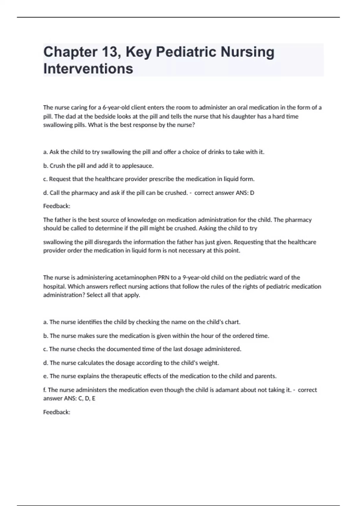 Chapter 13, Key Pediatric Nursing Interventions The nurse caring for a 6-year-old client enters the room to administer an oral medication in the form of a pill. The dad at the bedside looks at the pill and tells the nurse that his daughter has a hard time swallowing pills. What is the best response by the nurse? a. Ask the child to try swallowing the pill and offer a choice of drinks to take with it. b. Crush the pill and add it to applesauce. c. Request that the healthcare provider prescribe the medication in liquid form. d. Call the pharmacy and ask if the pill can be crushed. - correct answer ANS: D Feedback: The father is the best source of knowledge on medication administration for the child. The pharmacy should be called to determine if the pill might be crushed. Asking the child to try swallowing the pill disregards the information the father has just given. Requesting that the healthcare provider order the medication in liquid form is not necessary at this point. The nurse is administering acetaminophen PRN to a 9-year-old child on the pediatric ward of the hospital. Which answers reflect nursing actions that follow the rules of the rights of pediatric medication administration? Select all that apply. a. The nurse identifies the child by checking the name on the child's chart. b. The nurse makes sure the medication is given within the hour of the ordered time. c. The nurse checks the documented time of the last dosage administered. d. The nurse calculates the dosage according to the child's weight. e. The nurse explains the therapeutic effects of the medication to the child and parents. f. The nurse administers the medication even though the child is adamant about not taking it. - correct answer ANS: C, D, E Feedback: