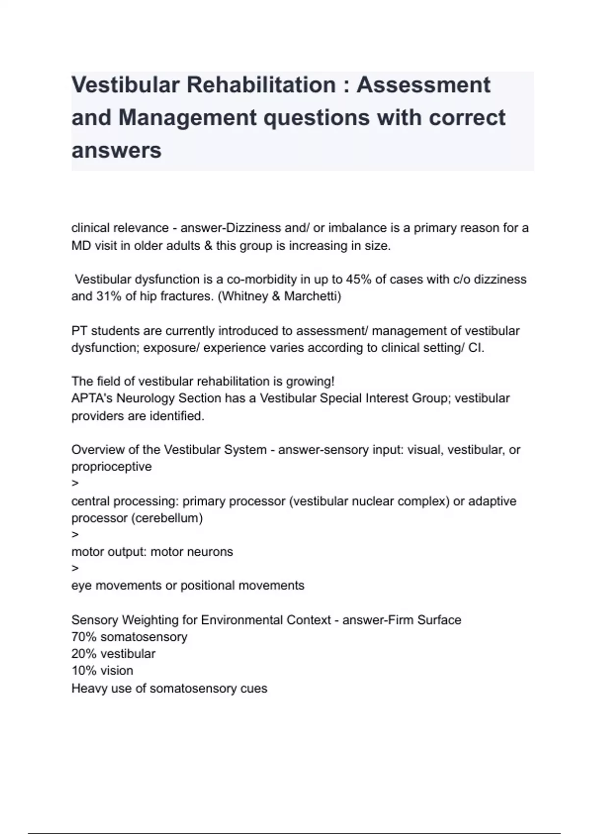 Vestibular Rehabilitation : Assessment and Management questions with correct answers clinical relevance - answer-Dizziness and/ or imbalance is a primary reason for a MD visit in older adults & this group is increasing in size. Vestibular dysfunction is a co-morbidity in up to 45% of cases with c/o dizziness and 31% of hip fractures. (Whitney & Marchetti) PT students are currently introduced to assessment/ management of vestibular dysfunction; exposure/ experience varies according to clinical setting/ CI. The field of vestibular rehabilitation is growing! APTA's Neurology Section has a Vestibular Special Interest Group; vestibular providers are identified. Overview of the Vestibular System - answer-sensory input: visual, vestibular, or propriocept