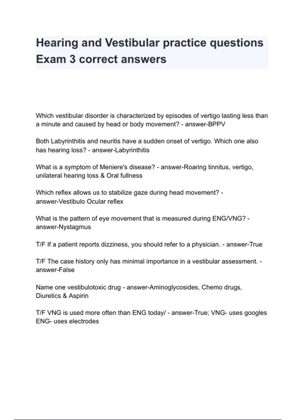 Hearing and Vestibular practice questions Exam 3 correct answers