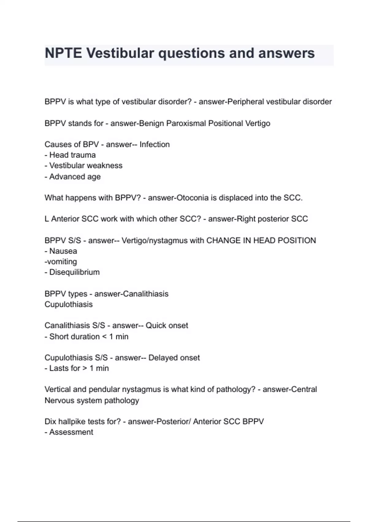 BPPV is what type of vestibular disorder? - answer-Peripheral vestibular disorder BPPV stands for - answer-Benign Paroxismal Positional Vertigo Causes of BPV - answer-- Infection - Head trauma - Vestibular weakness - Advanced age What happens with BPPV? - answer-Otoconia is displaced into the SCC. L Anterior SCC work with which other SCC? - answer-Right posterior SCC BPPV S/S - answer-- Vertigo/nystagmus with CHANGE IN HEAD POSITION - Nausea -vomiting - Disequilibrium BPPV types - answer-Canalithiasis Cupulothiasis Canalithiasis S/S - answer-- Quick onset - Short duration < 1 min Cupulothiasis S/S - answer-- Delayed onset - Lasts for > 1 min Vertical and pendular nystagmus is what kind of pathology? - answer-Central Nerv