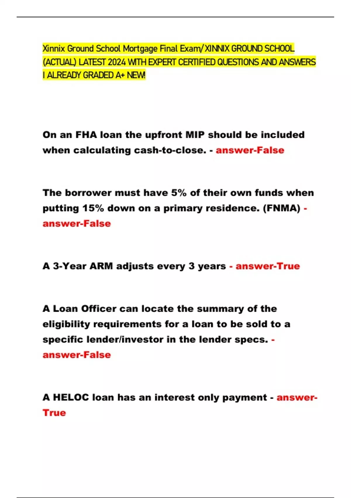 Xinnix Ground School Mortgage Final Exam/ XINNIX GROUND SCHOOL (ACTUAL) LATEST 2024 WITH EXPERT CERTIFIED QUESTIONS AND ANSWERS I ALREADY GRADED A+ NEW!