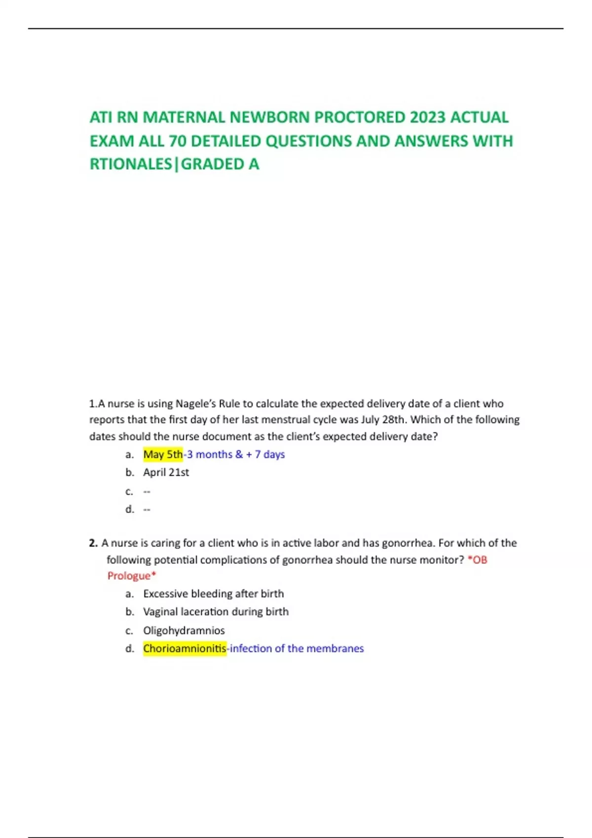 ATI RN MATERNAL NEWBORN PROCTORED 2023 ACTUAL EXAM ALL 70 DETAILED QUESTIONS AND ANSWERS WITH RTIONALES|GRADED A