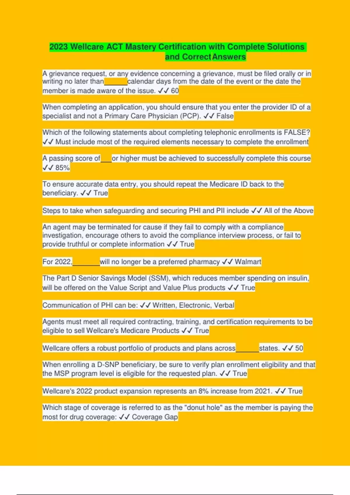 A grievance request, or any evidence concerning a grievance, must be filed orally or in writing no later than calendar days from the date of the event or the date the member is made aware of the issue. 60 When completing an application, you should ensure that you enter the provider ID of a specialist and not a Primary Care Physician (PCP). False Which of the following statements about completing telephonic enrollments is FALSE? Must include most of the required elements necessary to complete the enrollment A passing score of or higher must be achieved to successfully complete this course 85% To ensure accurate data entry, you should repeat the Medicare ID back to the beneficiary. True Steps to take when safeguarding and securing PHI and PII include All of the Above An agent may be terminated for cause if they fail to comply with a compliance investigation, encourage others to avoid the compliance interview process, or fail to provide truthful or complete information True For 2022, will no longer be a preferred pharmacy Walmart The Part D Senior Savings Model (SSM), which reduces member spending on insulin, will be offered on the Value Script and Value Plus products True Communication of PHI can be: Written, Electronic, Verbal Agents must meet all required contracting, training, and certification requirements to be eligible to sell Wellcare's Medicare Products True Wellcare offers a robust portfolio of products and plans across states. 50 When enrolling a D-SNP beneficiary, be sure to verify plan enrollment eligibility and that the MSP program level is eligible for the requested plan. True Wellcare's 2022 product expansion represents an 8% incre
