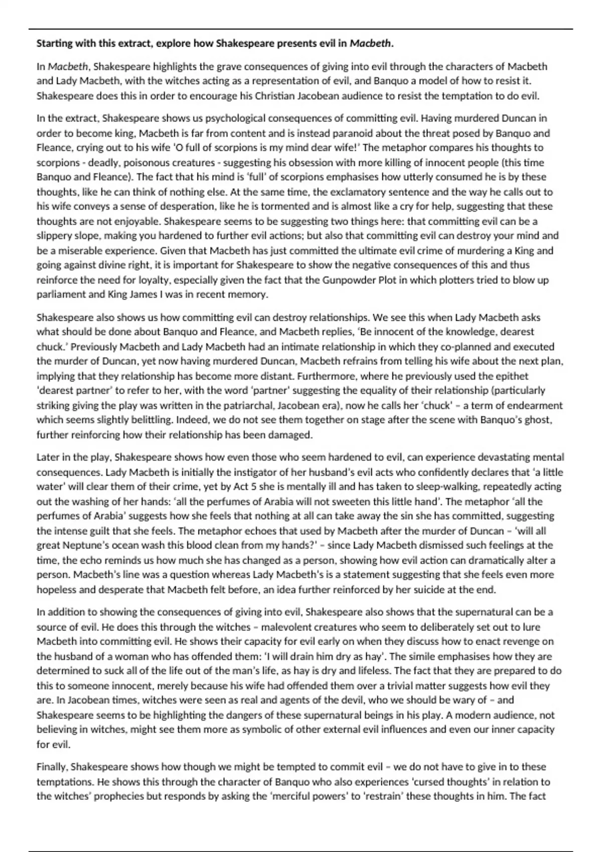 This document is a grade 9 top marks essay exploring how evil is presented in the play Macbeth. This essay focuses on how evil is portrayed through Macbeth and Lady Macbeth. Provides a strong essay structure that can be applicable to any English AQA essay.