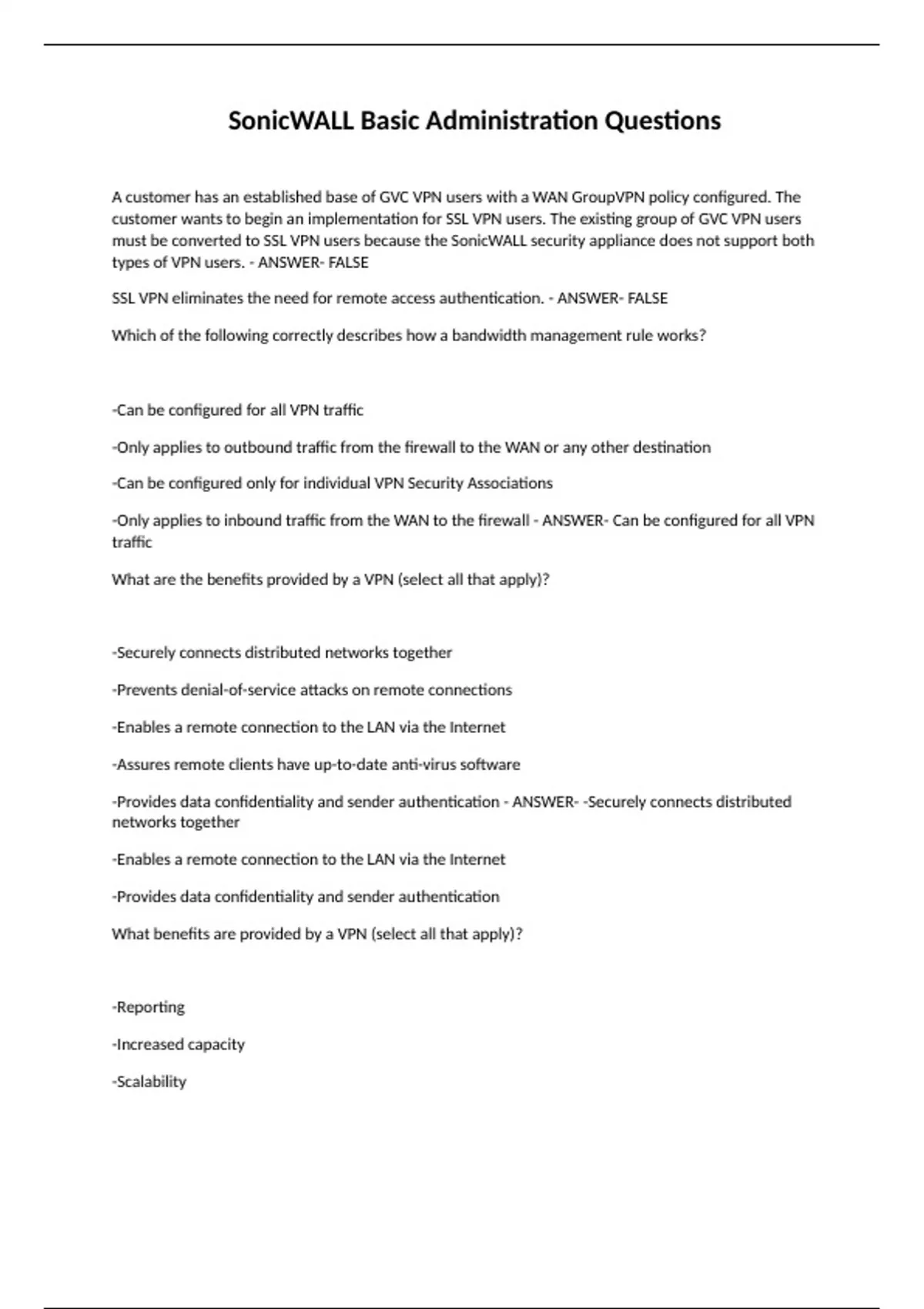 A customer has an established base of GVC VPN users with a WAN GroupVPN policy configured. The customer wants to begin an implementation for SSL VPN users. The existing group of GVC VPN users must be converted to SSL VPN users because the SonicWALL security appliance does not support both types of VPN users. - ANSWER- FALSE SSL VPN eliminates the need for remote access authentication. - ANSWER- FALSE Which of the following correctly describes how a bandwidth management rule works? -Can be configured for all VPN traffic -Only applies to outbound traffic from the firewall to the WAN or any other destination -Can be configured only for individual VPN Security Associations -Only applies to inbound traffic from the WAN to the firewall - ANSWER- Can be configured for all VPN traffic