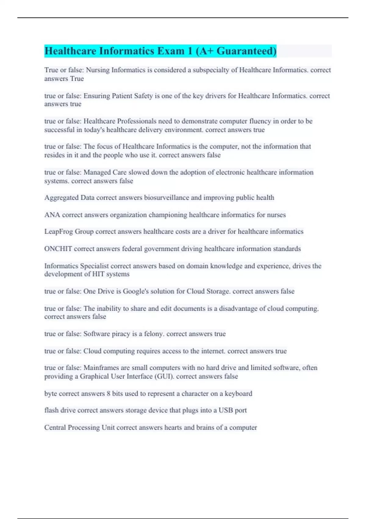 True or false: Nursing Informatics is considered a subspecialty of Healthcare Informatics. correct answers True true or false: Ensuring Patient Safety is one of the key drivers for Healthcare Informatics. correct answers true true or false: Healthcare Professionals need to demonstrate computer fluency in order to be successful in today's healthcare delivery environment. correct answers true true or false: The focus of Healthcare Informatics is the computer, not the information that resides in it and the people who use it. correct answers false true or false: Managed Care slowed down the adoption of electronic healthcare information systems. correct answers false Aggregated Data correct answers biosurveillance and improving public health ANA correct answers organization championing healthcare informatics for nurses LeapFrog Group correct answers healthcare costs are a driver for healthcare informatics ONCHIT correct answers federal government driving healthcare information standards Informatics Specialist correct answers based on domain knowledge and experience, drives the development of HIT systems true or false: One Drive is Google's solution for Cloud Storage. correct answers false true or false: The inability to share and edit documents is a disadvantage of cloud computing. correct answers false true or false: Software piracy is a felony. correct answers true true or false: Cloud computing requires access to the internet. correct answers true true or false: Mainframes are small computers with no hard drive and limited software, often providing a Graphical User Interface (GUI). correct answers false byte correct answers 8 bits used to represent a character on a keyboard flash drive correct answers storage device that plugs into a USB port Central Processing Unit correct answers hearts and brains of a computer