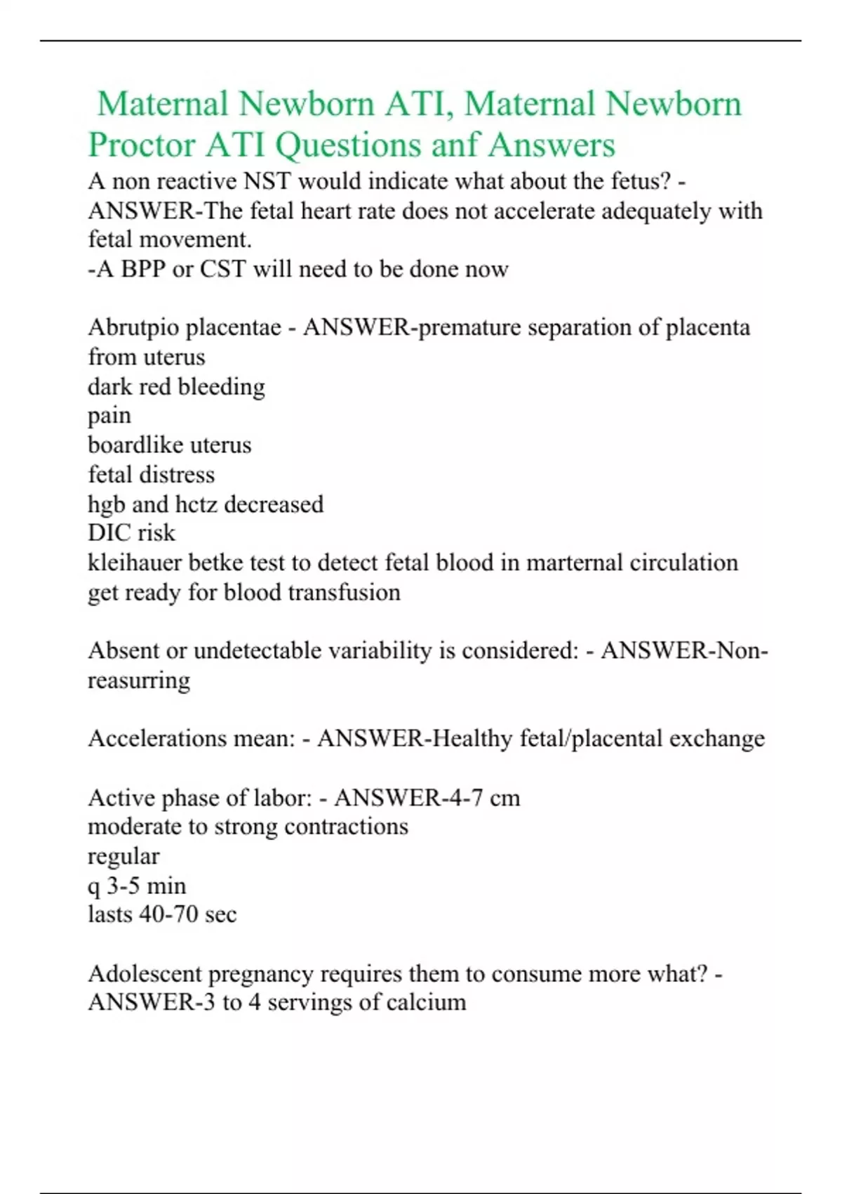 Maternal Newborn ATI, Maternal Newborn Proctor ATI Questions anf Answers A non reactive NST would indicate what about the fetus? - ANSWER-The fetal heart rate does not accelerate adequately with fetal movement. -A BPP or CST will need to be done now Abrutpio placentae - ANSWER-premature separation of placenta from uterus dark red bleeding pain boardlike uterus fetal distress hgb and hctz decreased DIC risk kleihauer betke test to detect fetal blood in marternal circulation get ready for blood transfusion Absent or undetectable variability is considered: - ANSWER-Non-reasurring Accelerations mean: - ANSWER-Healthy fetal/placental exchange Active phase of labor: - ANSWER-4-7 cm moderate to strong contractions regular q 3-5 min lasts 40-70 sec Adolescent pregnancy requires them to consume more what? - ANSWER-3 to 4 servings of calcium AFP can be measured from the amniotic fluid between: - ANSWER-16 and 18 weeks alpha-fetoprotein after how many days is the fundus no longer palpable? - ANSWER-10 days amniocentesis - ANSWER-needs to have empty bladder An amniocentesis may be performed when? - ANSWER-After 14 weeks gestation An amnioinfusion can be used to: - ANSWER-Reduce severity of variable decelerations (cord compression) Dilute meconium-stained amniotic fluid anticonvulsants - ANSWER-cause false positive pregnancy tests weaken birth control medications APGAR Reflex irritability - ANSWER-0= none 2= grimace 3= cry APGAR RR scoring - ANSWER-0= absent 1= slow, weak cry 2= good cry APGAR Color scoring - ANSWER-0= Blue, pale 1= pink body, cyanotic hands and feet (acrocyanosis) 2= Completely pink APGAR Heart rate scoring - ANSWER-0= absent 1= 100 2= 100 APGAR Muscle tone scoring - ANSWER-0= Flaccid 1= some flexion 2= well-flexed APGAR of 0-3 indicates - ANSWER-severe distress APGAR of 7-10 indicates - ANSWER-no distres APGAR or 4-6 indicates - ANSWER-moderate distress APGAR scoring is: - ANSWER-a brief physical exam done immediately following birth to rule out abnormalities. Ballottment - ANSWER-positioning of fetus its a presumptive sign of pregnancy Basal Body temp - ANSWER-temp drops during ovulation Before administering pitocin, where should the fetus be? - ANSWER-engaged in the birth canal at a minimum of 0 station. Betamethoasone - ANSWER-Glucocorticoid given to enhance fetal lung maturity and surfactant production. Between 18 and 30 weeks the fundal height should measure what? - ANSWER-It should equal the week of gestation biophysical profile (BPP) normal score is - ANSWER-A biophysical profile (BPP) test measures the health of your baby (fetus) during pregnancy. 8-10 bishop score - ANSWER-9 nullipara 5 multipara BPP abnormal score is - ANSWER-4 BPP assess for - ANSWER-Fetal well being C-reactive protein - ANSWER-1.0 mg/dl calcium intake for pregnant women - ANSWER-1000 Calendar method - ANSWER-ovulation occurs 14 days before onset of next menstrual cycle and avoids intercourse during that period, days 8-19 is fertile period calories per day for pregnant women - ANSWER-500 calories Candida Albicans S&S - ANSWER-Vulvar itching Thick, creamy white vag discharge Vulvar redness White patches on vag walls Gray white patches on tongue and gums caput succadaneum - ANSWER-localized swelling of the soft tissues of the scalp caused by pressure on the head during labor.........normal finding......crosses suture line Caput Succedaneum is: - ANSWER-Normal Should resolve within 24 hrs carboprost - ANSWER-promotes contractions and used for hemorrhage se is hypertension fever diarrhea cephalhematoma - ANSWER-collection of blood between periosteum and skull bone that it covers does not cross suture line results from trauma during birth