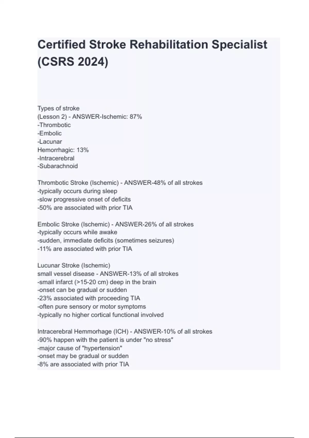 Types of stroke (Lesson 2) - ANSWER-Ischemic: 87% -Thrombotic -Embolic -Lacunar Hemorrhagic: 13% -Intracerebral -Subarachnoid Thrombotic Stroke (Ischemic) - ANSWER-48% of all strokes -typically occurs during sleep -slow progressive onset of deficits -50% are associated with prior TIA Embolic Stroke (Ischemic) - ANSWER-26% of all strokes -typically occurs while awake -sudden, immediate deficits (sometimes seizures) -11% are associated with prior TIA Lucunar Stroke (Ischemic) small vessel disease - ANSWER-13% of all strokes -small in