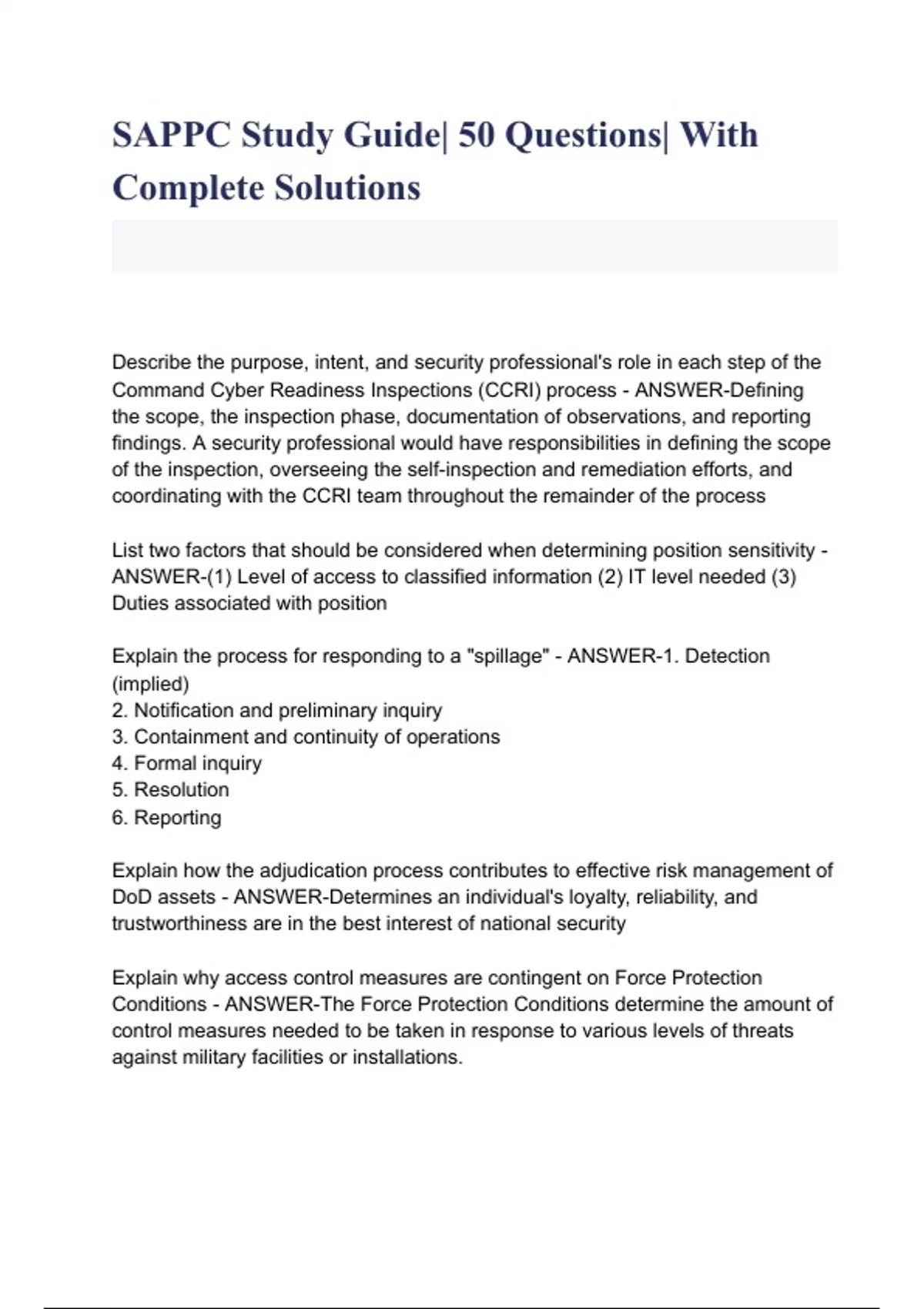 Describe the purpose, intent, and security professional's role in each step of the Command Cyber Readiness Inspections (CCRI) process - ANSWER-Defining the scope, the inspection phase, documentation of observations, and reporting findings. A security professional would have responsibilities in defining the scope of the inspection, overseeing the self-inspection and remediation efforts, and coordinating with the CCRI team throughout the remainder of the process List two factors that should be considered when determining position sensitivity - ANSWER-(1) Level of access to classified information (2) IT level needed (3) Duties associated with position Explain the process for responding to a "spillage" - ANSWER-1. Detection (implied) 2. Notification and preliminary inquiry 3. Containment and continuity of operations 4. Formal inquiry 5. Resolution 6. Reporting Explain how the adjudication process contributes to effective risk management of DoD assets -