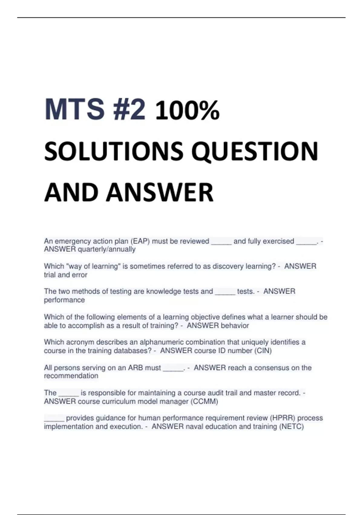 MTS #2 100% SOLUTIONS QUESTION AND ANSWER An emergency action plan (EAP) must be reviewed _____ and fully exercised _____. - ANSWER quarterly/annually Which "way of learning" is sometimes referred to as discovery learning? - ANSWER trial and error The two methods of testing are knowledge tests and _____ tests. - ANSWER performance Which of the following elements of a learning objective defines what a learner should be able to accomplish as a result of training? - ANSWER behavior Which acronym describes an alphanumeric combination that uniquely identifies a course in the training databases? - ANSWER course ID number (CIN) All persons serving on an ARB must _____. - ANSWER reach a consensus on the recommendation The _____ is responsible for maintaining a course audit trail and master record. - ANSWER course curriculum model manager (CCMM) _____ provides guidance for human performance requirement review (HPRR) process implementation and execution. - ANSWER naval education and training (NETC) T/F all E-4 and below occupational standards (OCCSTDS) are taught in "A" school. - ANSWER false Which is not an internal trigger to perform a job duty task analysis (JDTA)? - ANSWER human performance requirement review (HPRR) Which of the following are elements of a business case analysis (BCA)? - ANSWER all of the above Which section of the training project plan (TPP) covers the reasons for and anticipated benefits of the proposed project? - ANSWER justification The finalized course training task list (CTTL) completed in the analyze phase - ANSWER duties and tasks How many stages are involved in developing materials of personnel performance profile (PPP)-based curriculum development? - ANSWER 8 NAVEDTRA _____ is the integrated learning environment (ILE) course development and lifecycle maintenance manual. - ANSWER 136 Who approves test design and maintains master test item bank? - ANSWER course curriculum model manager (CCMM