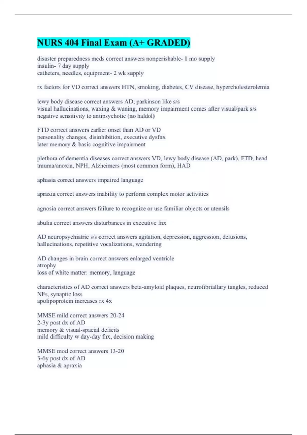 disaster preparedness meds correct answers nonperishable- 1 mo supply insulin- 7 day supply catheters, needles, equipment- 2 wk supply rx factors for VD correct answers HTN, smoking, diabetes, CV disease, hypercholesterolemia lewy body disease correct answers AD; parkinson like s/s visual hallucinations, waxing & waning, memory impairment comes after visual/park s/s negative sensitivity to antipsychotic (no haldol) FTD correct answers earlier onset than AD or VD personality changes, disinhibition, executive dysfnx later memory & basic cognitive impairment plethora of dementia diseases correct answers VD, lewy body disease (AD, park), FTD, head trauma/anoxia, NPH, Alzheimers (most common form), HAD aphasia correct answers impaired language apraxia correct answers inability to perform complex motor activities agnosia correct answers failure to recognize or use familiar objects or utensils abulia correct answers disturbances in executive fnx AD neuropsychiatric s/s correct answers agitation, depression, aggression, delusions, hallucinations, repetitive vocalizations, wandering AD changes in brain correct answers enlarged ventricle atrophy loss of white matter: memory, language characteristics of AD correct answers beta-amyloid plaques, neurofibriallary tangles, reduced NFs, synaptic loss apolipoprotein increases rx 4x MMSE mild correct answers 20-24 2-3y post dx of AD memory & visual-spacial deficits mild difficulty w day-day fnx, decision making MMSE mod correct answers 13-20 3-6y post dx of AD aphasia & apraxia