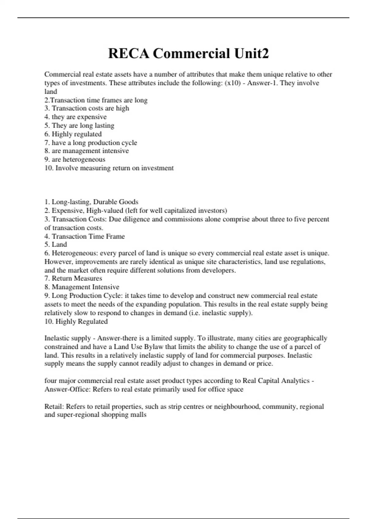 Commercial real estate assets have a number of attributes that make them unique relative to other types of investments. These attributes include the following: (x10) - Answer-1. They involve land 2.Transaction time frames are long 3. Transaction costs are high 4. they are expensive 5. They are long lasting 6. Highly regulated 7. have a long production cycle 8. are management intensive 9. are heterogeneous 10. Involve measuring return on investment 1. Long-lasting, Durable Goods 2. Expensive, High-valued (left for well capitalized investors) 3. Transaction Costs: Due diligence and commissions alone comprise about three to five percent of transaction costs. 4. Transaction Time Frame 5. Land 6. Heterogeneous: every parcel of land is unique so every commercial real estate asset is unique. However, improvements are rarely identical as unique site characteristics, land use regulations, and the market often require different solutions from developers. 7. Return Measures 8. Management Intensive 9. Long Production Cycle: it takes time to develop and construct new commercial real estate assets to meet the needs of the expanding population. This results in the real estate supply being relatively slow to respond to changes in demand (i.e. inelastic supply). 10. Highly Regulated Inelastic supply - Answer-there is a limited supply. To illustrate, many cities are geographically constrained and have a Land Use Bylaw that limits the ability to change the use of a parcel of land. This results in a relatively inelastic supply of land for commercial purposes. Inelastic supply means the supply cannot readily adjust to changes in demand or price. four major commercial real estate asset product types according to Real Capital Analytics - Answer-Office: Refers to real estate primarily used for office space Retail: Refers to retail properties, such as strip centres or neighbourhood, community, regional and super-regional shopping malls