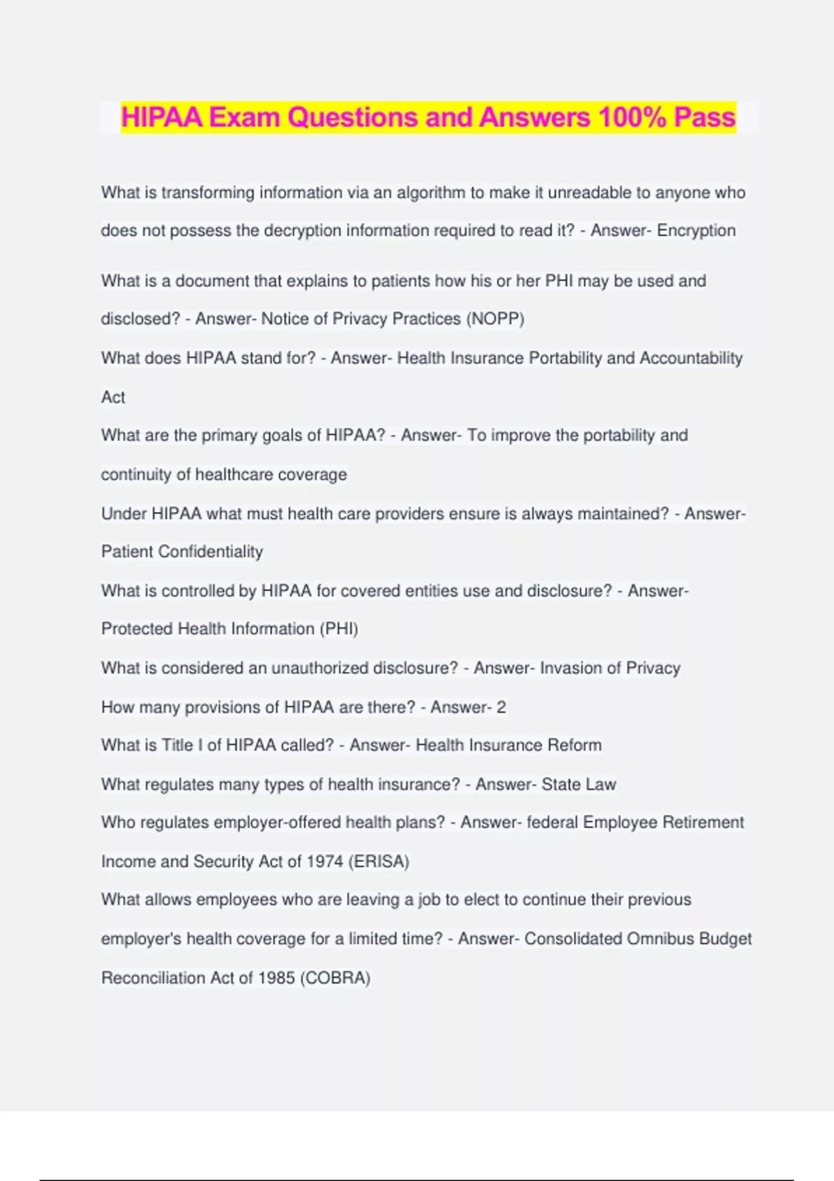 HIPAA Exam Questions and Answers 100% Pass What is transforming information via an algorithm to make it unreadable to anyone who does not possess the decryption information required to read it? - Answer- Encryption What is a document that explains to patients how his or her PHI may be used and disclosed? - Answer- Notice of Privacy Practices (NOPP) What does HIPAA stand for? - Answer- Health Insurance Portability and Accountability Act What are the primary goals of HIPAA? - Answer- To improve the portability and continuity of healthcare coverage Under HIPAA what must health care providers ensure is always maintained? - Answer- Patient Confidentiality What is controlled by HIPAA for covered entities use and disclosure? - Answer- Protected Health Information (PHI) What is considered an unauthorized disclosure? - Answer- Invasion of Privacy How many provisions of HIPAA are there? - Answer- 2 What is Title I of HIPAA called? - Answer- Health Insurance Reform What regulates many types of health insurance? - Answer- State Law Who regulates employer-offered health plans? - Answer- federal Employee Retirement Income and Security Act of 1974 (ERISA) What allows employees who are leaving a job to elect to continue their previous employer's health coverage for a limited time? - Answer- Consolidated Omnibus Budget Reconciliation Act of 1985 (COBRA) What is Title II of HIPAA called? - Answer- Administrative Simplification What restricted electronic transfer of healthcare data, gave patients more rights regarding their own personal health information, and put in place better security of this information? - Answer- Title II of HIPAA What was encouraged so routine business information exchange could be exchanged between computers? - Answer- Electronic Data Interchange (EDI) Who have increased controls over the way they manage and store patient information? - Answer- Pharmacies What must be protected by healthcare personnel, including pharmacy technicians, who must know which types of information they can release? - Answer- Access to Medical Records What must be handled with great care? - Answer- Discarded Patient Information (DPI) When patient records are to be discarded, they should be destroyed by whom? - Answer- A licensed, bonded company