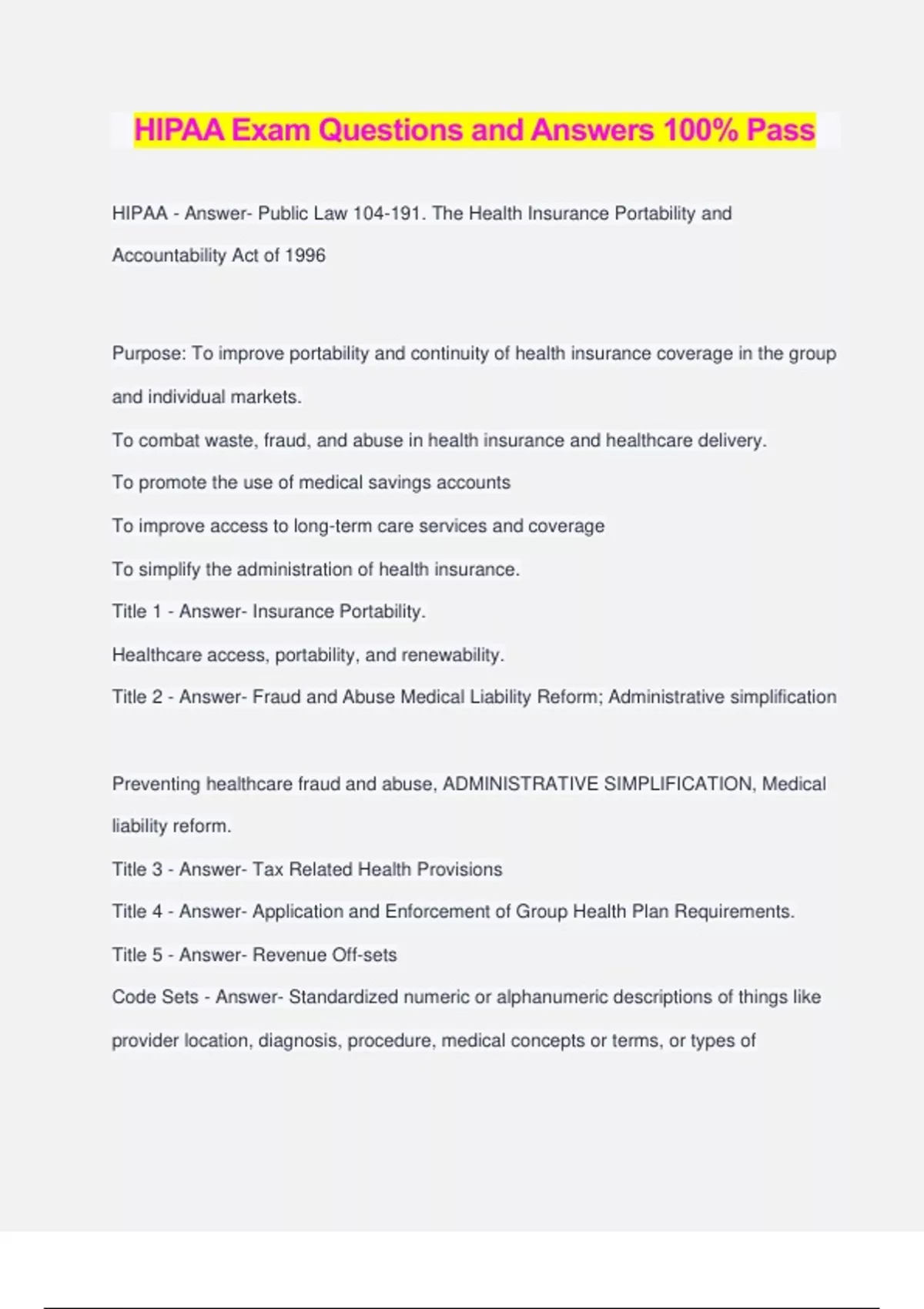 HIPAA Exam Questions and Answers 100% Pass HIPAA - Answer- Public Law 104-191. The Health Insurance Portability and Accountability Act of 1996 Purpose: To improve portability and continuity of health insurance coverage in the group and individual markets. To combat waste, fraud, and abuse in health insurance and healthcare delivery. To promote the use of medical savings accounts To improve access to long-term care services and coverage To simplify the administration of health insurance. Title 1 - Answer- Insurance Portability. Healthcare access, portability, and renewability. Title 2 - Answer- Fraud and Abuse Medical Liability Reform; Administrative simplification Preventing healthcare fraud and abuse, ADMINISTRATIVE SIMPLIFICATION, Medical liability reform. Title 3 - Answer- Tax Related Health Provisions Title 4 - Answer- Application and Enforcement of Group Health Plan Requirements. Title 5 - Answer- Revenue Off-sets Code Sets - Answer- Standardized numeric or alphanumeric descriptions of things like provider location, diagnosis, procedure, medical concepts or terms, or types of transactions being sent between healthcare entities electronically HIPAA codes must be utilized by covered entities. Data Element - Answer- Each detail of a visit to a provider such as patient name, address, date of service, location, and other information captured for record keeping and future evaluation, treatment, billing, and reporting purposes. Dental Codes (CDT) - Answer- Standards set by the American Dental Association to identify procedures done by dentists in their offices published as the Code on Dental Procedures and Nomenclature. ICD10 - Answer- A code group which can be assigned to diagnosis and procedures. The list is called the International Classification of Diseases, Ninth Revision, Clinical Modification, and is created and maintained by National Center for Health Statistics (NCHS) and the Center for Medicare and Medicaid Service (CMS). National Employer Identifier (EIN) - Answer- An employer identification number originally created by the IRS for tax purposes and subsequently adopted as the national standard to designate companies providing employee healthcare coverage for HIPAA purposes. Electronic Data Interchange (EDI) - Answer- The generic standards for exchanging business data electronically on which the rules and guidelines for HIPAA Transactions are based. EDI is more universal in scope than just providing guidance for the healthcare industry. Healthcare Financing Administration Procedure Coding System (HCPCS) - Answer- The Healthcare Financing Administration has undergone a name change and is now known as the Centers for Medicare and Medicaid Services (CMS). CMS and HHS update and distribute this code set to be used for things not identified in other approved lists. National Drug Code (NDC) - Answer- These codes are created and maintained by the FDA and allow standardized identification of drugs. National Health Identifier for Individuals (NHI) - Answer- Still has not been implemented due to privacy concerns. National Health Plan Identifier (HPID) - Answer- A proposed unique identifier for health plans and other payers of healthcare claims not formally proposed or defined at this time. National Council for Prescription Drug Programs (NCPDP) - Answer- Used for retail pharmacy transactions. Retail pharmacies are the only healthcare entities which use a different set of transmission standards (not codes). The two NCPDP formats which health plans must accept are Telecommunications Standard Format Version 5.1 and Batch Standard Version 1.0. National Plan and Provider Enumeration System (NPPES) - Answer- A plan within the HIPAA legislation to allow a third party contractor or contractors to create, verify, and assign NPI numbers, and to maintain the National Provider System and the National Provider File Database. National Provider Identifier (NPI) - Answer- The unique identifier for healthcare providers used for HIPAA compliance