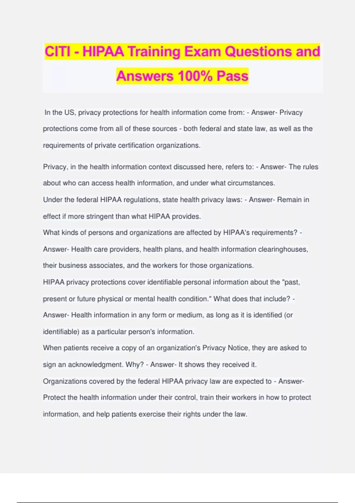 CITI - HIPAA Training Exam Questions and Answers 100% Pass In the US, privacy protections for health information come from: - Answer- Privacy protections come from all of these sources - both federal and state law, as well as the requirements of private certification organizations. Privacy, in the health information context discussed here, refers to: - Answer- The rules about who can access health information, and under what circumstances. Under the federal HIPAA regulations, state health privacy laws: - Answer- Remain in effect if more stringent than what HIPAA provides. What kinds of persons and organizations are affected by HIPAA's requirements? - Answer- Health care providers, health plans, and health information clearinghouses, their business associates, and the workers for those organizations. HIPAA privacy protections cover identifiable personal information about the "past, present or future physical or mental health condition." What does that include? - Answer- Health information in any form or medium, as long as it is identified (or identifiable) as a particular person's information. When patients receive a copy of an organization's Privacy Notice, they are asked to sign an acknowledgment. Why? - Answer- It shows they received it. Organizations covered by the federal HIPAA privacy law are expected to - Answer- Protect the health information under their control, train their workers in how to protect information, and help patients exercise their rights under the law. Which of these is not a right under HIPAA? - Answer- To control all disclosures of information in the health record. What does HIPAA's "minimum necessary" standard require of health care workers? - Answer- Use or disclose only the minimum necessary amount of health information to accomplish a task. HIPAA's "incidental uses and disclosures" provision excuses deviations from the minimum necessary standard. What is excused? - Answer- Truly accidental "excess" uses and disclosures, where reasonable caution was otherwise used and there was no negligence. When a privacy problem is discovered, which of the following is/are true? - Answer- All of the above HIPAA allows health care organizations to control many information decisions. But where the patient retains control, which of the following is/are true? - Answer- If a person has a right to make a health care decision, then he/she has a right to control information associated with that decision. With respect to permissions for uses and disclosures, HIPAA divides up health information into three categories. Into which category does information related to" treatment, payment and health care operations" go? - Answer- Uses or disclosures that generally require oral agreement only. With respect to permissions for uses and disclosures, HIPAA divides up health information into three categories. Into which category do discussions with family members go? - Answer- Uses or disclosures that require generally oral agreement only. With respect to permissions for uses and disclosures, HIPAA divides up health information into three categories. Into which category does information related to research, marketing and fundraising go? - Answer- Uses or disclosures that generally require specific written authorization. Which of the following are organizations required to do under HIPAA? - Answer- Appoint a Privacy Officer to administer HIPAA rules. HIPAA allows healthcare organizations to control many information decisions. However, where the patient retains control, which of the following is true? - Answer- If a person has a right to make a healthcare decision, then generally that person has a right to control information associated with the decision. Which of these is not generally a good practice for telephone use? - Answer- Using voicemail systems and answering machines that do not require a password or PIN for access