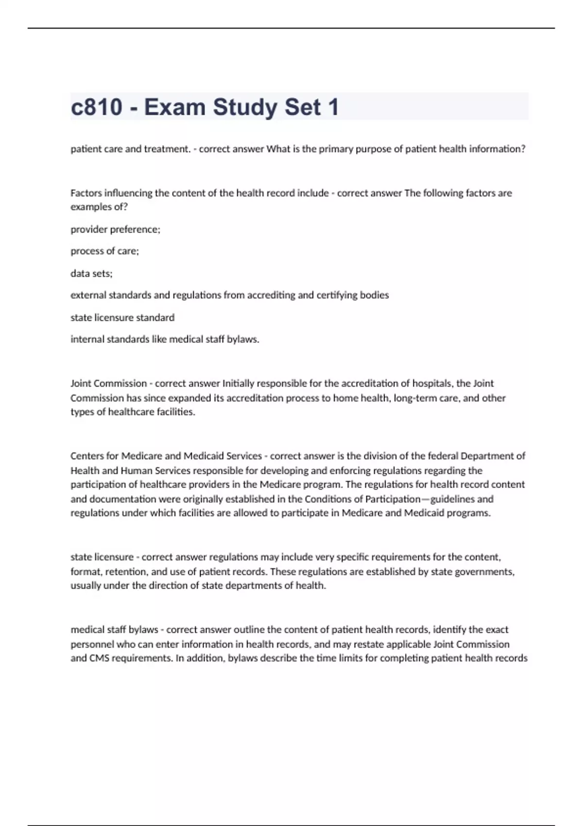 C810 - Exam Study Set 1 Prediction Exam Questions 2024. patient care and treatment. - correct answer What is the primary purpose of patient health information? Factors influencing the content of the health record include - correct answer The following factors are examples of? provider preference; process of care; data sets; external standards and regulations from accrediting and certifying bodies state licensure standard internal standards like medical staff bylaws. Joint Commission - correct answer Initially responsible for the accreditation of hospitals, the Joint Commission has since expanded its accreditation process to home health, long-term care, and other types of healthcare facilities. Centers for Medicare and Medicaid Services - correct answer is the division of the federal Department of Health and Human Services responsible for developing and enforcing regulations regarding the participation of healthcare providers in the Medicare program. The regulations for health record content and documentation were originally established in the Conditions of Participation—guidelines and regulations under which facilities are allowed to participate in Medicare and Medicaid programs.