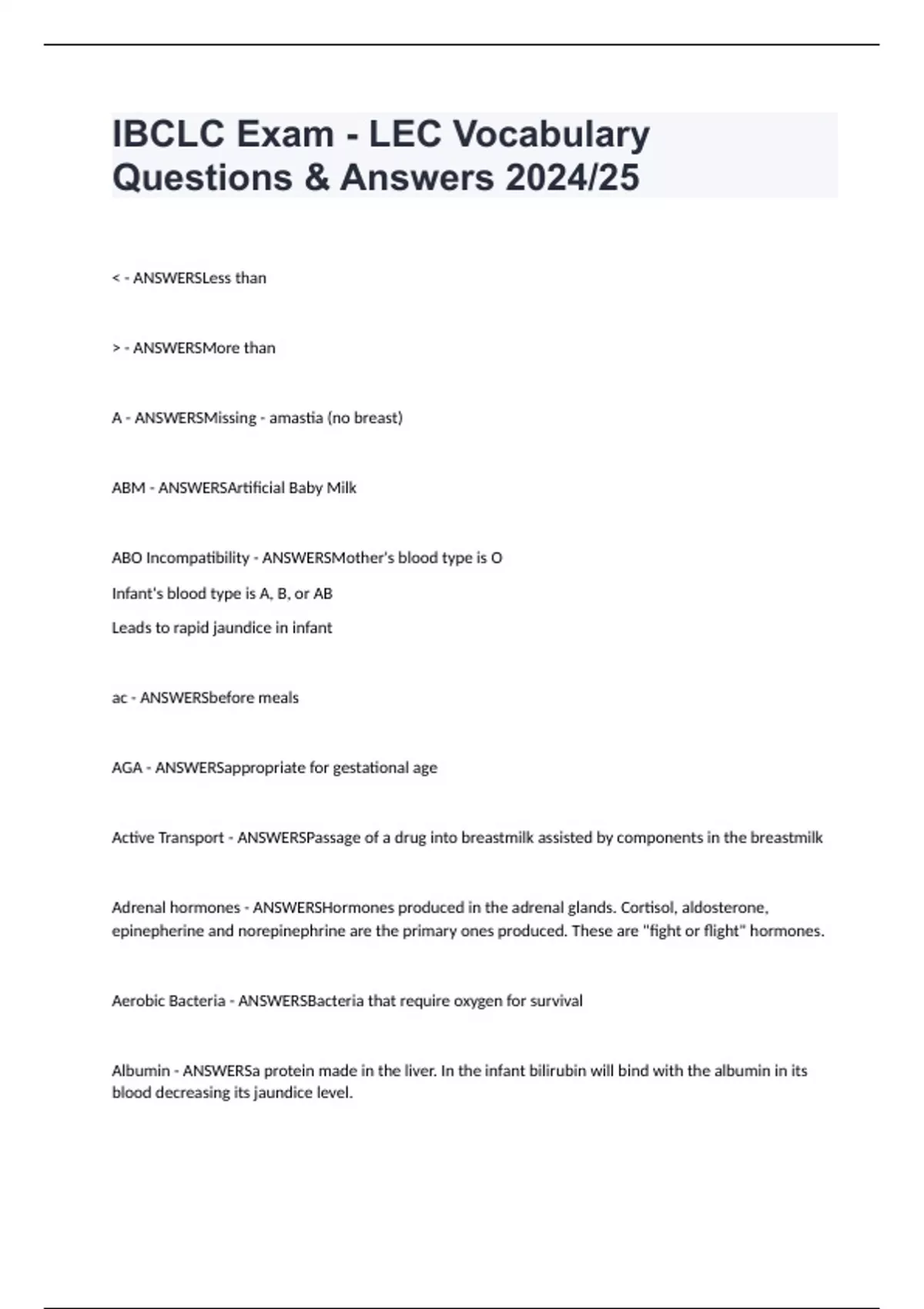 IBCLC Exam - LEC Vocabulary Questions & Answers 2024/25 < - ANSWERSLess than > - ANSWERSMore than A - ANSWERSMissing - amastia (no breast) ABM - ANSWERSArtificial Baby Milk ABO Incompatibility - ANSWERSMother's blood type is O Infant's blood type is A, B, or AB Leads to rapid jaundice in infant ac - ANSWERSbefore meals AGA - ANSWERSappropriate for gestational age Active Transport - ANSWERSPassage of a drug into breastmilk assisted by components in the breastmilk Adrenal hormones - ANSWERSHormones produced in the adrenal glands. Cortisol, aldosterone, epinepherine and norepinephrine are the primary ones produced. These are "fight or flight" hormones. Aerobic Bacteria - ANSWERSBacteria that require oxygen for survival Albumin - ANSWERSa protein made in the liver. In the infant bilirubin will bind with the albumin in its blood decreasing its jaundice level.