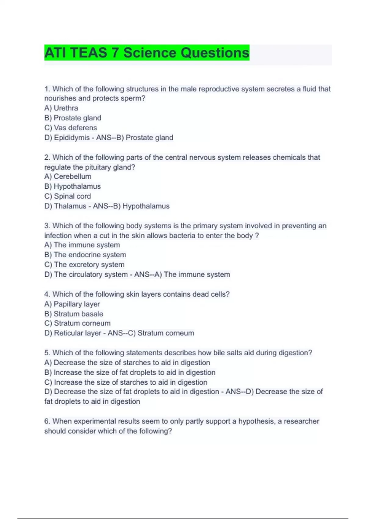1. Which of the following structures in the male reproductive system secretes a fluid that nourishes and protects sperm? A) Urethra B) Prostate gland C) Vas deferens D) Epididymis - ANS--B) Prostate gland 2. Which of the following parts of the central nervous system releases chemicals that regulate the pituitary gland? A) Cerebellum B) Hypothalamus C) Spinal cord D) Thalamus - ANS--B) Hypothalamus 3. Which of the following body systems is the primary system involved in preventing an infection when a cut in the skin allows bacteria to enter the body ? A) The immune system B) The endocrine system C) The excretory system D) The circulatory system - ANS--A) The immune system 4. Which of the following skin layers contains dead cells? A) Papillary layer B) Stratum basale C) Stratum corneum D) Reticular layer - ANS--C) Stratum corneum 5. Which of the following stat