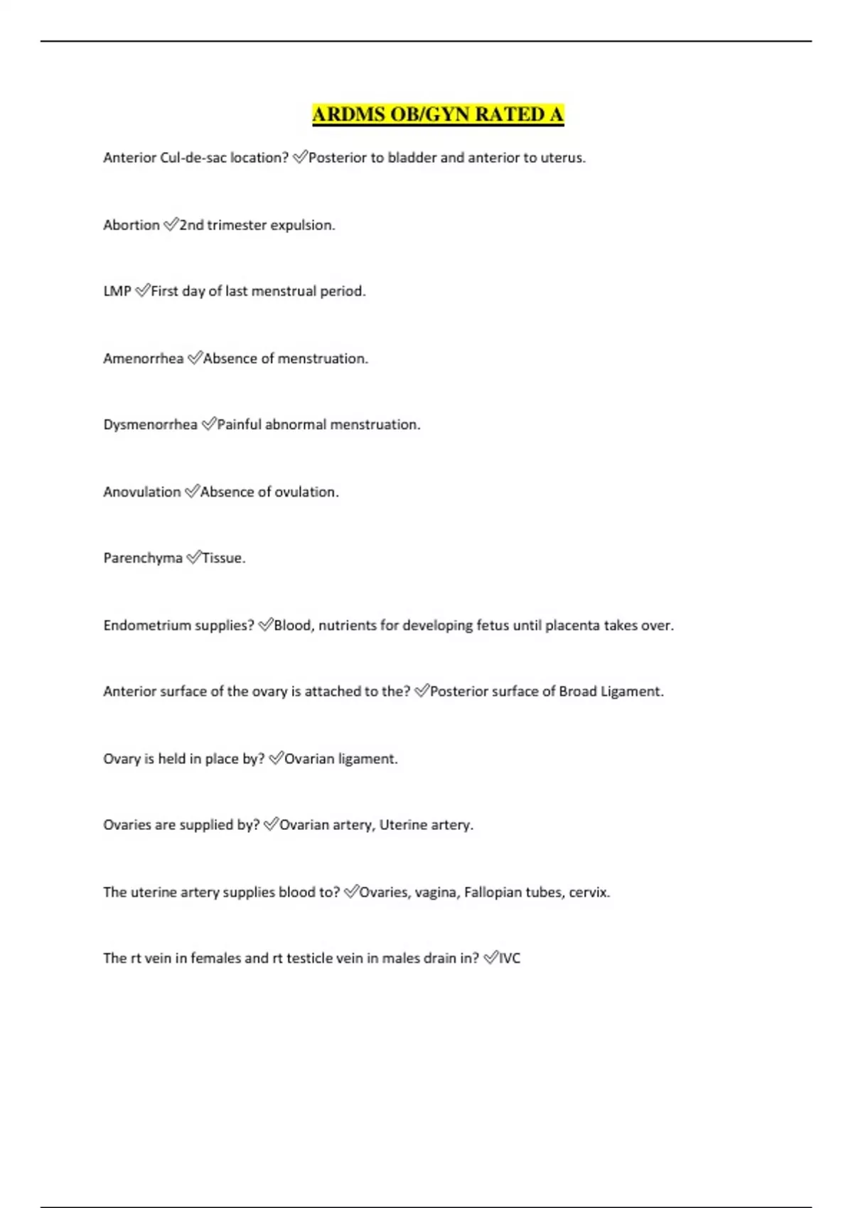 ARDMS OB/GYN RATED A Anterior Cul-de-sac location? Posterior to bladder and anterior to uterus. Abortion 2nd trimester expulsion. LMP First day of last menstrual period. Amenorrhea Absence of menstruation. Dysmenorrhea Painful abnormal menstruation. Anovulation Absence of ovulation. Parenchyma Tissue. Endometrium supplies? Blood, nutrients for developing fetus until placenta takes over. Anterior surface of the ovary is attached to the? Posterior surface of Broad Ligament. Ovary is held in place by? Ovarian ligament. Ovaries are supplied by? Ovarian artery, Uterine artery. The uterine artery supplies blood to? Ovaries, vagina, Fallopian tubes, cervix. The rt vein in females and rt testicle vein in males drain in? IVC Left ovarian vein in females and left testicle vein in males drain to? Left renal vein. Oopherectomy Surgical removal of ovaries. Hysterectomy Surgical removal of uterus. Average length of menstrual cycle? 28 days. Ovulation occurs on? Day 14. One follicle dominates and matures into? Graffian Follicle. Estrogen helps in rebuilding of? Endometrial tissue, breast tissue. Corpus Luteum produces large amount of? Progesterone. Ovaries produce? Estrogen, progesterone. Nabothian Cyst Cysts found in the cervix. Gartner's Duct Cyst? Most common cystic lesion of the Gardner Cyst. Reason for scanning for IUD? Placement, rupture of IUD. Copper T T-shaped device, consists of copper. Lippes Loop Creates a series of bright echoes. Dalkon Shield Ovoid with small legs Ovarian Torsion 180 degree or 360 degrees twist of ovary. Requires surgery. Ovarian Torsion signs? Sever pain, Nausea/vomit, Rt side pain. What is Pelvic Inflammatory Disease? An infection that ascends from the cervix into the uterus then enters Fallopian tubes and ovaries. Causes of PID? Infections, STD's, IUD's, Post abortions, post surgeries. Pyosalpinx Accumulation of puss in lumen of the Fallopian tubes. Hydrosalpinx A collection of fluid within a scarred or obstructed Fallopian tube. Normal collection of fluid in P Cul-de-sac reasons? Menstrual cycle, Follicular rupture, P