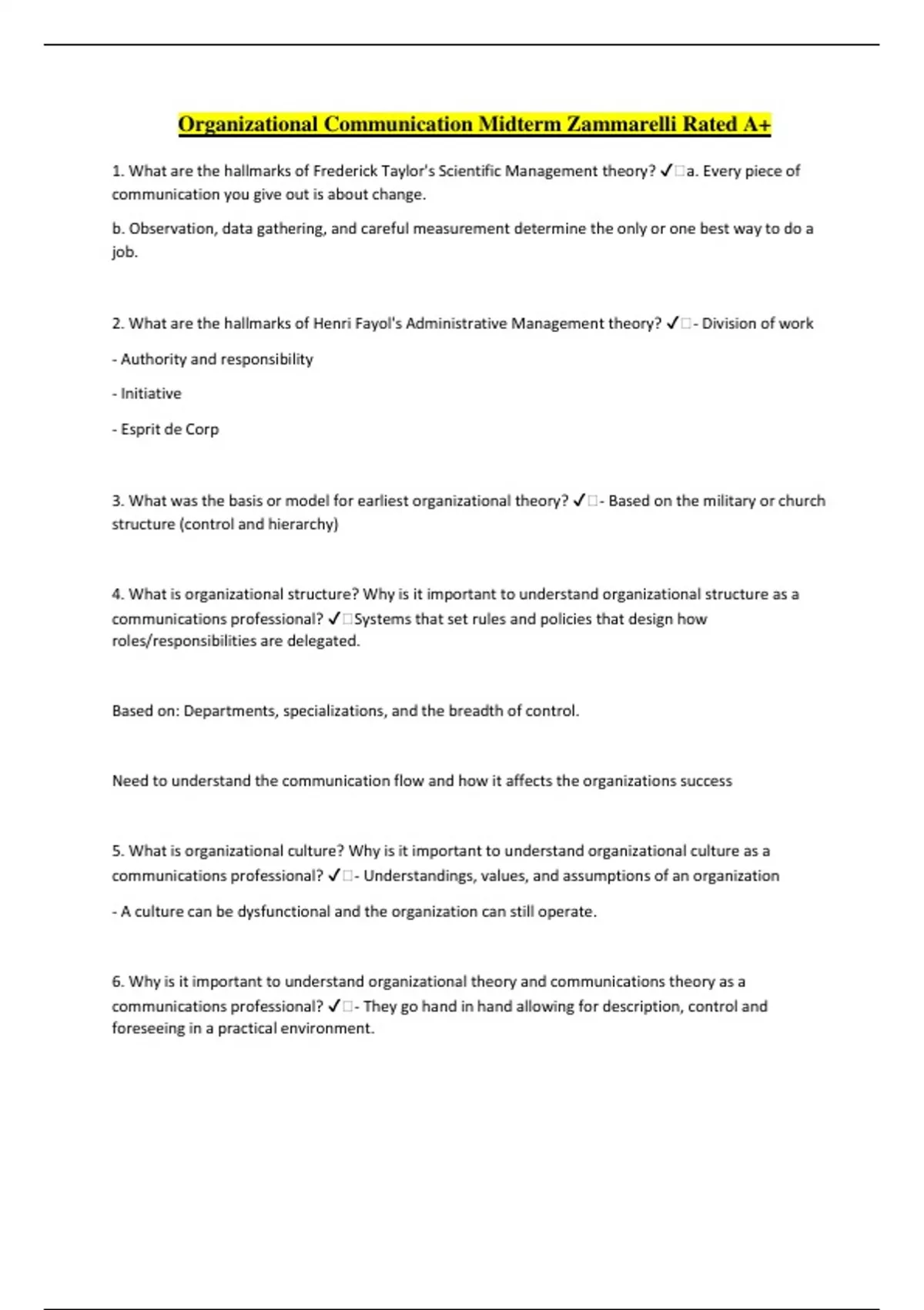 Organizational Communication Midterm Zammarelli Rated A+ 1. What are the hallmarks of Frederick Taylor's Scientific Management theory? ️a. Every piece of communication you give out is about change. b. Observation, data gathering, and careful measurement determine the only or one best way to do a job. 2. What are the hallmarks of Henri Fayol's Administrative Management theory? ️- Division of work - Authority and responsibility - Initiative - Esprit de Corp 3. What was the basis or model for earliest organizational theory? ️- Based on the military or church structure (control and hierarchy) 4. What is organizational structure? Why is it important to understand organizational structure as a communications professional? ️Systems that set rules and policies that design how roles/responsibilities are delegated. Based on: Departments, specializations, and the breadth of control. Need to understand the communication flow and how it affects the organizations success 5. What is organizational culture? Why is it important to understand organizational culture as a communications professional? ️- Understandings, values, and assumptions of an organization - A culture can be dysfunctional and the organization can still operate. 6. Why is it important to understand organizational theory and communications theory as a communications professional? ️- They go hand in hand allowing for description, control and foreseeing in a practical environment. 7. Name three types of organizational structure. ️- Project Based Structure - Centered around projects and teams. Less top down management - Hierarchal Structure - Major department heads report to upper level management - Virtual Structure - Teams meet in cyberspace. Not bound by geography and relies on technology 8. Can a strategic communications plan only be used by communications professionals? Is it a viable tool for other areas of business to achieve strategic goals? (Hint: Think direct deposit.) ️- No, They can be used in any type of organization - Yes, because it can help an organization map out their goals and how to get there 9. Please list two communication's myths. ️- It is easy to train someone to become an effective communicator - Organizational communication pertains only to businesses and those who study business - If I say the words, they should understand 10. What is Human Relations Theory? ️- Realizing employees are humans with human needs and that if met, would increase productivity 11. What is Human Resources Theory? ️- Being able to know what employees are capable beyond their current role, and providing them an environment to make that impact. 12. What is Cultural Theory? ️- Knowing that there is organizational culture and that factors into the success of an organization 13. What is Critical Theory? ️- Focuses on power and abuses of power through communication and control. 14. Using Claude Shannon's model of communication as your basis, what phase(s), if any, of organizational communication have changed in the Information Age? ️- The channel of communication has changed. We now have email, text messages, video chat. 15. What is organizational climate? ️- A combination of actual conditions in the organization and the perception of conditions in the organization 16. What characterizes a supportive climate? ️- When communication is encouraged/morale 17. Who is Claude Shannon and why is he closely associated with organizational communication? ️- The father of information theory. He wrote the mathematical theory of communication which lays out the basics of communication o Source produces a message. o Channel carries message o Receiver gets message 18. According to Zaremba, what are open systems? ️- It is a system that organizations cannot live without interacting with both internal and external environments. 19. What is load? ️- The number of messages moving through the communication system 20. What are the differences between Theory X and Theory Y? ️- Theory X: Workers are lazy, if you leave them on your own they won't accomplish anything - Theory Y: Motivating people and offering the right work environment will make them productive 21. In watching the episode of Undercover Boss, what org communication weaknesses or gaps did the CEO find within Waste management? ️- Higher management weren't listening to the issues of the employees. There was no empathy. (Penalty for every minute of late clock in) 22. In an organization, what are enterprise tools and why are they important? ️- Applications that are goal oriented and are designed to help employees. Can help employees communicate better 23. What is a stakeholder? ️- Anyone with an interest, good or bad, in the activities outlined in the