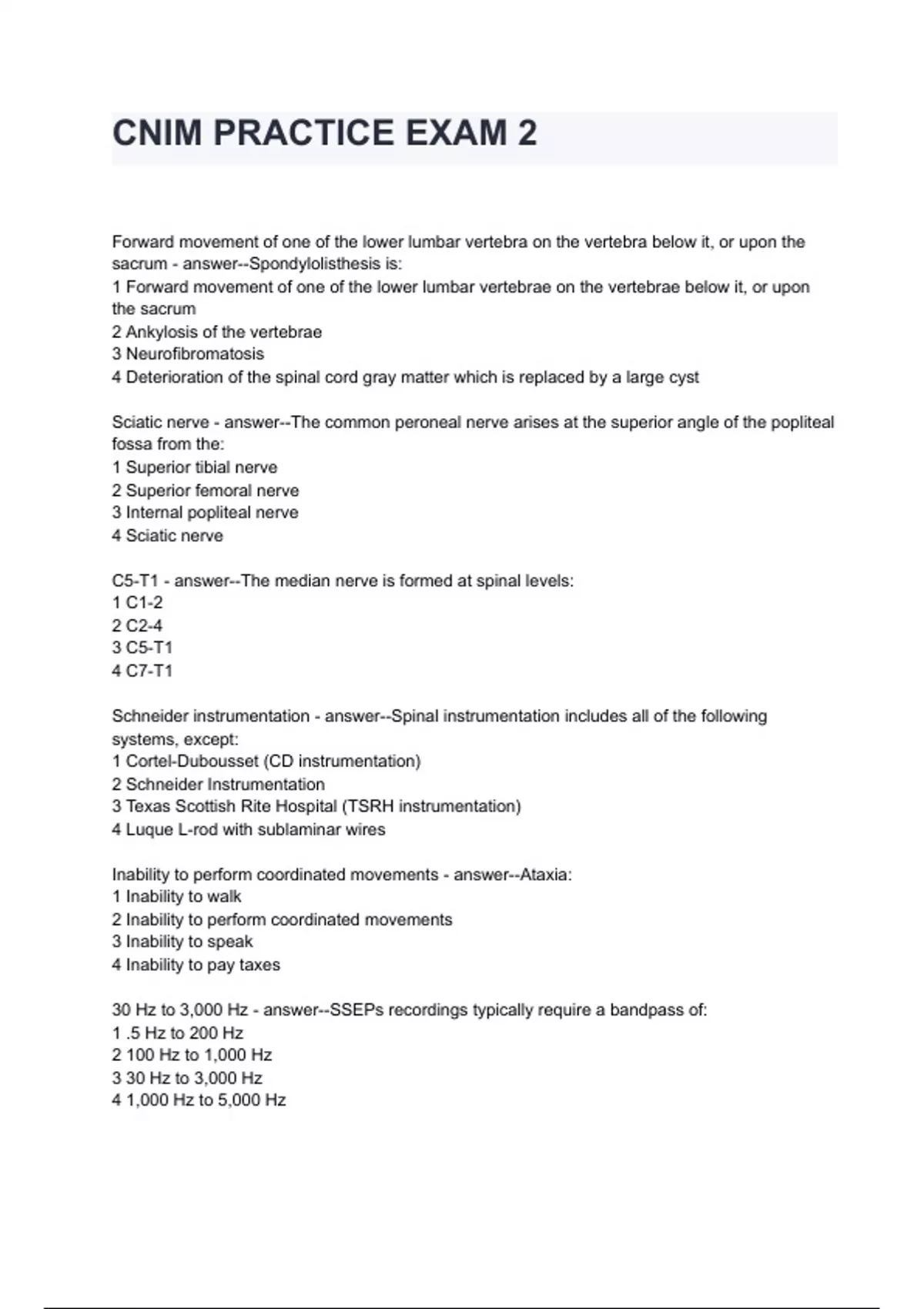 Forward movement of one of the lower lumbar vertebra on the vertebra below it, or upon the sacrum - answer--Spondylolisthesis is: 1 Forward movement of one of the lower lumbar vertebrae on the vertebrae below it, or upon the sacrum 2 Ankylosis of the vertebrae 3 Neurofibromatosis 4 Deterioration of the spinal cord gray matter which is replaced by a large cyst Sciatic nerve - answer--The common peroneal nerve arises at the superior angle of the popliteal fossa from the: 1 Superior tibial nerve 2 Superior femoral nerve 3 Internal popliteal nerve 4 Sciatic nerve C5-T1 - answer--The median nerve is formed at spinal levels: 1 C1-2 2 C2-4 3 C5-T1 4 C7-T1 Schneider instrumentation - answer--Spinal instrumentation includes all of the following systems, except: 1 Cortel-Dubousset (CD instrumentation) 2 Schneider Instrumentation 3 Texas Scottish Rite Hospital (TSRH instrumentation) 4 Luque L-rod with sublaminar wires Inability to perform coordinated movements - answer--Ataxia: 1 Inability to walk 2 Inability to perform coordinated movements 3 Inability to speak 4 Inability to pay taxes 30 Hz to 3,000 Hz - answer--SSEPs rec