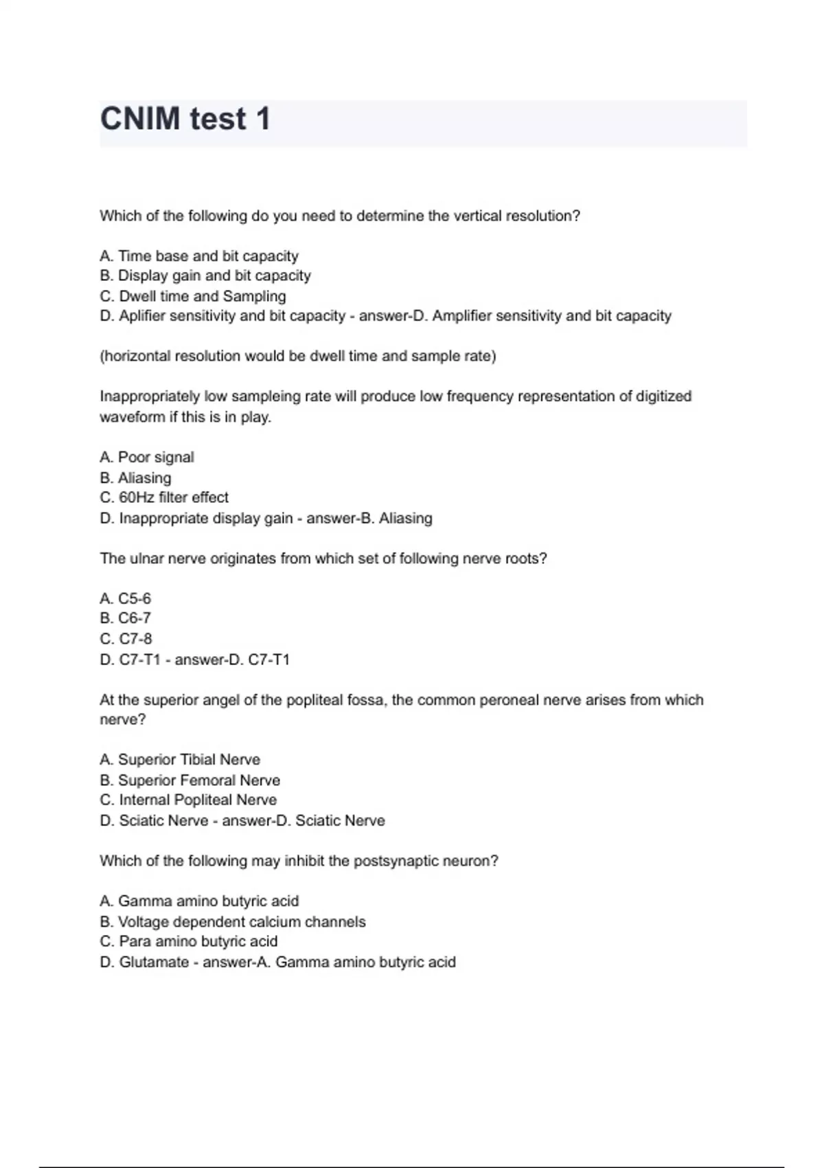 CNIM test 1 Which of the following do you need to determine the vertical resolution? A. Time base and bit capacity B. Display gain and bit capacity C. Dwell time and Sampling D. Aplifier sensitivity and bit capacity - answer-D. Amplifier sensitivity and bit capacity (horizontal resolution would be dwell time and sample rate) Inappropriately low sampleing rate will produce low frequency representation of digitized waveform if this is in play. A. Poor signal B. Aliasing C. 60Hz filter effect D. Inappropriate display gain - answer-B. Aliasing The ulnar nerve originates from which set of following nerve roots? A. C5-6 B. C6-7 C. C7-8 D. C7-T1 - answer-D. C7-T1 At the superior angel of the popliteal fossa, the common peroneal nerve arises from which nerve? A. Superior Tibial Nerve B. Superior Femoral Nerve C. Internal Popliteal Nerve D. Sciatic Nerve - answer-D. Sciatic Nerve Which of the following may inhibit the postsynaptic neuron? A. Gam