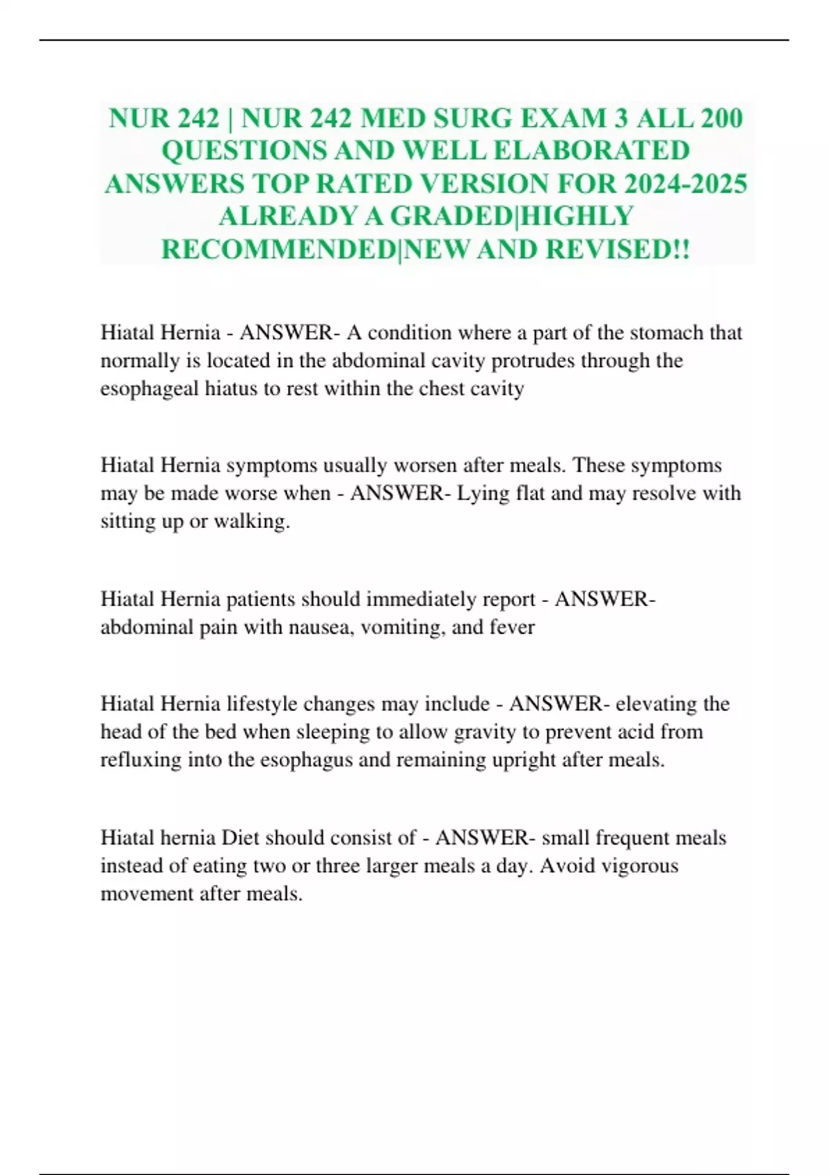 NUR 242 | NUR 242 MED SURG EXAM 3 ALL 200 QUESTIONS AND WELL ELABORATED ANSWERS TOP RATED VERSION FOR ALREADY A GRADED|HIGHLY RECOMMENDED|NEW AND REVISED!!