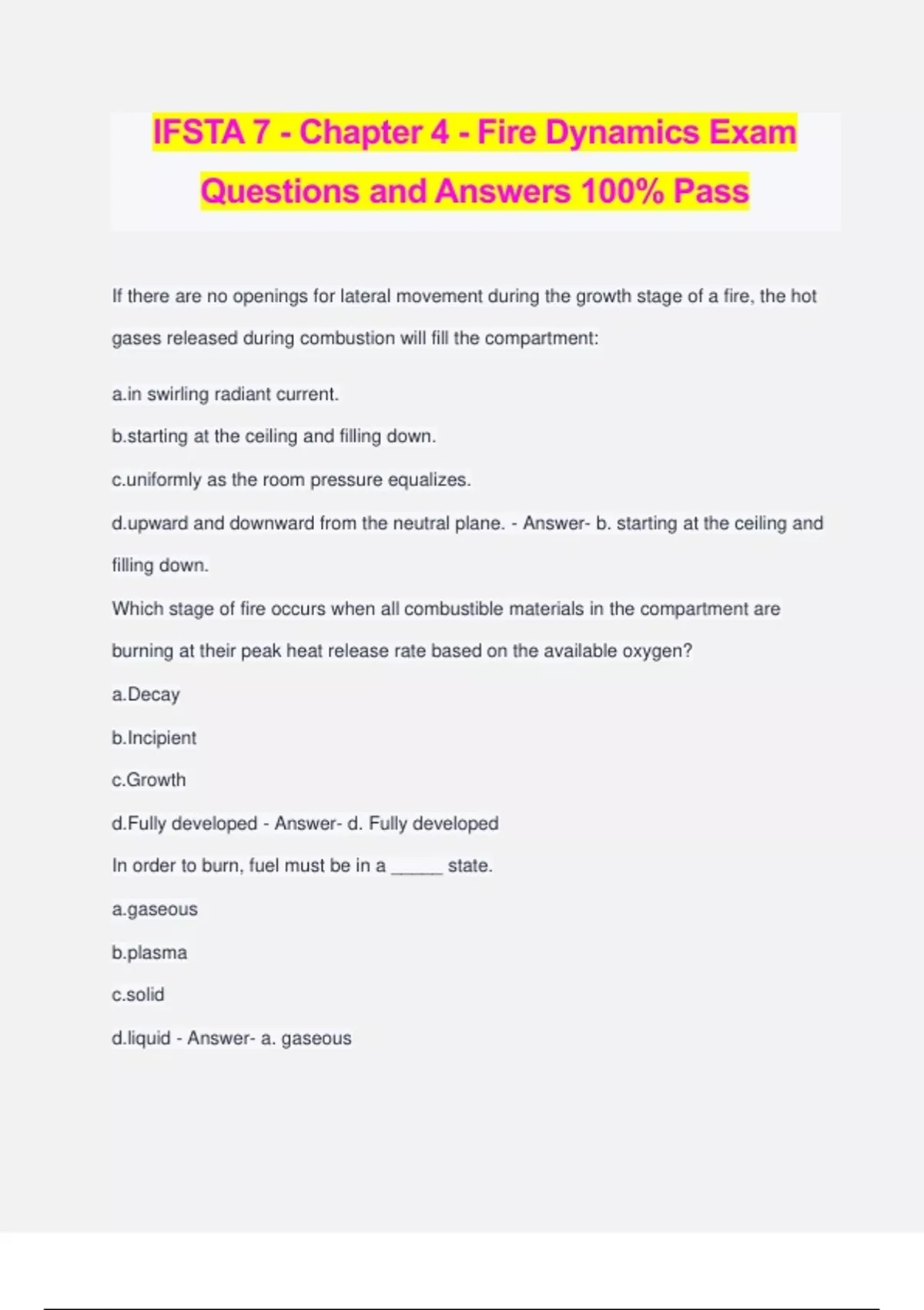 IFSTA 7 - Chapter 4 - Fire Dynamics Exam Questions and Answers 100% Pass If there are no openings for lateral movement during the growth stage of a fire, the hot gases released during combustion will fill the compartment: swirling radiant current. ing at the ceiling and filling down. rmly as the room pressure equalizes. d and downward from the neutral plane. - Answer- b. starting at the ceiling and filling down. Which stage of fire occurs when all combustible materials in the compartment are burning at their peak heat release rate based on the available oxygen? a.Decay b.Incipient c.Growth d.Fully developed - Answer- d. Fully developed In order to burn, fuel must be in a _____ state. us a d - Answer- a. gaseous A fuel's _____ is the total amount of thermal energy released when a specific amount of that fuel burns. cal content of combustion ic content of reduction - Answer- b. heat of combustion Which statement about smoke is accurate? a.Smoke is a product of complete combustion. b.Smoke contains a higher concentration of oxygen than air does. c.Smoke has the potential to burn. d.Smoke has a relatively low vapor pressure. - Answer- c. Smoke has the potential to burn. Which element is included in the fire tetrahedron that is not part of the fire triangle model? a.Chemical chain reaction b.Heat c.Fuel d.Oxygen - Answer- a. Chemical chain reaction The range of concentrations of fuel vapor and air within which combustion can occur is the: able (explosive) range. -sustaining range. tion (combustion) range. -burning range. - Answer- a. flammable (explosive) range. Which type of fuel is difficult to extinguish using water as the only extinguishing agent? Select one: a.Miscible liquids b.Liquids that are less dense (lighter) than water c.Polar solvents d.Liquids that are more dense (heavier) than water - Answer- b. Liquids that are less dense (lighter) than water What is the primary consideration affecting how easily solid fuels ignite? a.Specific gravity b.Heat release rate c.Surface-to-mass ratio d.Total mass of the fuel - Answer- c. Surface-to-mass ratio Which is an example of a self-sustaining chemical reaction? a.Nonflaming combustion b.Chemical asphyxiation c.Flaming combustion d.Convective flow - Answer- c. Flaming combustion Which is a measure of heat energy transfer rate? a.Temperature b.Kinetic energy c.Heat flux d.Buoyancy - Answer- c. Heat flux Which statement about flow paths and ventilation in a structure is accurate? a.The flow is always unidirectional due to pressure differences where the heated fire gases move toward the seat of the fire. b.Once flow paths are established in a structure, it is difficult to alter or interrupt the flow of gases and ambient air. c.When firefighters make entry into a building, they establish new flow paths between the fire compartment and exterior vents of the building. d.When hot gases follow the flow path from areas of high to low pressure, they carry heat away and cool the structure. - Answer- c. When firefighters make entry into a building, they establish new flow paths between the fire compartment and exterior vents of the building. Slower fire development in large compartments is due to the _____ and the increased distance that radiated heat must travel from the fire to the contents that must be heated. er volume of air of building construction n-deficient atmosphere fuel loads - Answer- a. greater volume of air Heat transfers from one body to another