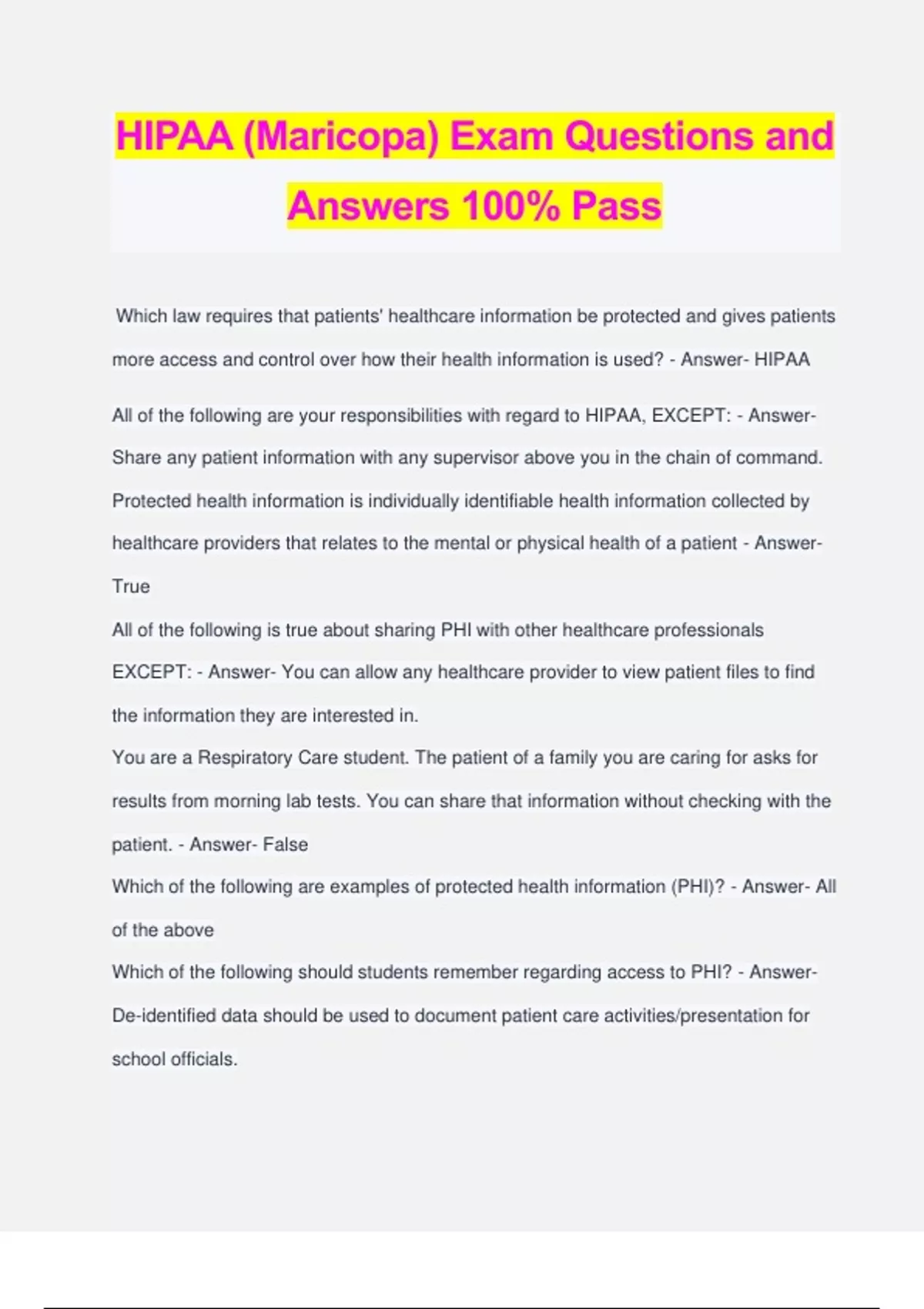 HIPAA (Maricopa) Exam Questions and Answers 100% Pass Which law requires that patients' healthcare information be protected and gives patients more access and control over how their health information is used? - Answer- HIPAA All of the following are your responsibilities with regard to HIPAA, EXCEPT: - Answer- Share any patient information with any supervisor above you in the chain of command. Protected health information is individually identifiable health information collected by healthcare providers that relates to the mental or physical health of a patient - Answer- True All of the following is true about sharing PHI with other healthcare professionals EXCEPT: - Answer- You can allow any healthcare provider to view patient files to find the information they are interested in. You are a Respiratory Care student. The patient of a family you are caring for asks for results from morning lab tests. You can share that information without checking with the patient. - Answer- False