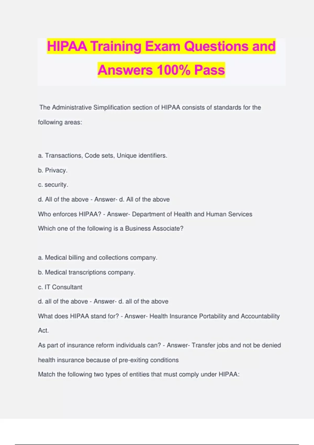 HIPAA Training Exam Questions and Answers 100% Pass The Administrative Simplification section of HIPAA consists of standards for the following areas: a. Transactions, Code sets, Unique identifiers. b. Privacy. c. security. d. All of the above - Answer- d. All of the above Who enforces HIPAA? - Answer- Department of Health and Human Services Which one of the following is a Business Associate? a. Medical billing and collections company. b. Medical transcriptions company. c. IT Consultant d. all of the above - Answer- d. all of the above What does HIPAA stand for? - Answer- Health Insurance Portability and Accountability Act. As part of insurance reform individuals can? - Answer- Transfer jobs and not be denied health insurance because of pre-exiting conditions Match the following two types of entities that must comply under HIPAA: 1. Covered Entities: 2. Business Associates: - Answer- 1. Covered Entities: Healthcare Providers, Health Plans, Healthcare Cleringhouses. 2. Business Associates: Third parties that perform services for or exchange data with Covered. Penalties for non-compliance can be which of the following types? - Answer- Civil and Criminal Which one of the following is Not a Covered entity? - Answer- Employer The five titles under HIPPA fall logically into which two major categories: - Answer- Administrative Simplification and Insurance reform The use of which of the following unique identifiers is controversial? - Answer- Patient ID (SSN) Match the following components of the HIPAA transaction standards with description: 1. HIPAA Standardized Transactions: 2. Code Sets: 3. Unique Identifiers: - Answer- 1. HIPAA Standardized Transactions: Standard transactions to streamline major health insurance processes. 2. Code Sets: Standard for describing diseases.