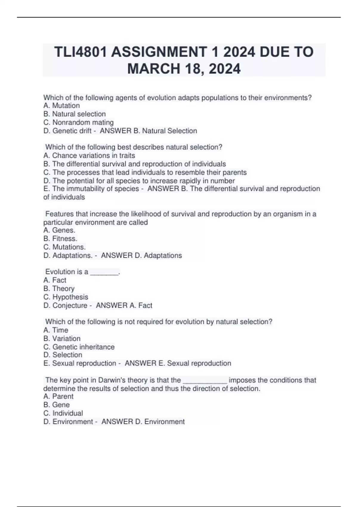 TLI4801 ASSIGNMENT 1 2024 DUE TO MARCH 18, 2024 Which of the following agents of evolution adapts populations to their environments? A. Mutation B. Natural selection C. Nonrandom mating D. Genetic drift - ANSWER B. Natural Selection Which of the following best describes natural selection? A. Chance variations in traits B. The differential survival and reproduction of individuals C. The processes that lead individuals to resemble their parents D. The potential for all species to increase rapidly in number E. The immutability of species - ANSWER B. The differential survival and reproduction of individuals Features that increase the likelihood of survival and reproduction by an organism in a particular environment are called A. Genes. B. Fitness. C. Mutations. D. Adaptations. - ANSWER D. Adaptations Evolution is a _______. A. Fact B. Theory C. Hypothesis D. Conjecture - ANSWER A. Fact Which of the following is not required for evolution by natural selection? A. Time B. Variation C. Genetic inheritance D. Selection E. Sexual reproduction - ANSWER E. Sexual reproduction The key point in Darwin's theory is that the ___________ imposes the conditions that determine the results of selection and thus the direction of selection. A. Parent B. Gene C. Individual D. Environment - ANSWER D. Environment The genetic contribution of an individual to succeeding generations, compared with that of other individuals in the population, is known as A. Variation. B. Microevolution. C. Macroevolution. D. Fitness. - ANSWER D. Fitness. In comparing artificial and natural selection, which of the following statements is true? A. Artificial selection is slower than natural selection. B. Artificial selection is reversible; natural selection is not. C. Artificial selection can produce maladaptive structures, natural selection cannot. D. Artificial selection cannot produce changes as large as changes produced by natural selection. E. In artificial selection, the magnitude of the selection pressure can be varied; in natural selection, it cannot. - ANSWER C. Artificial selection can produce maladaptive structures, natural selection cannot. Natural selection is based on all of the following except A. Genetic variation exists within populations. B. The best-adapted individuals tend to leave the most offspring. C. Populations tend to produce more individuals than the environment can support. D. Individuals adapt to their environments and, thereby, evolve - ANSWER D. Individuals adapt to their environments and, thereby, evolve Which of the following statements about evolution is false? A. Scientists have not been able to observe evolution in action. B. Evolutionary theory can be applied to solve practical problems. C. Biologists have accumulated a large body of evidence about the evolutionary changes that have occurred in the past. D. Biologists have accumulated a large body of evidence about how evolutionary changes occur. - ANSWER A. Scientists have not been able to observe evolution in action. During a study session about evolution, one of your fellow students remarks, "The giraffe stretched its neck while reaching for higher leaves; its offspring inherited longer necks as a result." Which statement is most likely to be helpful in correcting this student's misconception? A. Characteristics acquired during an organism's life are generally not passed on through genes. B. Spontaneous mutations can result in the appearance of new traits. C. Only favorable adaptations have survival value. D. Disuse of an organ may lead to its eventual disappearance. - ANSWER A. Characteristics acquired during an organism's life are generally not passed on through genes. Which of these conditions are always true of populations evolving due to natural selection? Condition 1: The population must vary in traits that are heritable. Condition 2: Some heritable traits must increase reproductive success. Condition 3: Individuals pass on all traits they acquire during their lifetime. A. Condition 1 only B. Condition 2 only C. Condition 1 and 2 D. Condition 1, 2, and 3 - ANSWER C. Condition 1 and 2 Similar habitats often place similar selection pressures on different species. This often leads to unrelated species having features in common. What is this an example of? A. Vestigial structures B. Convergent evolution C. Homologous tr