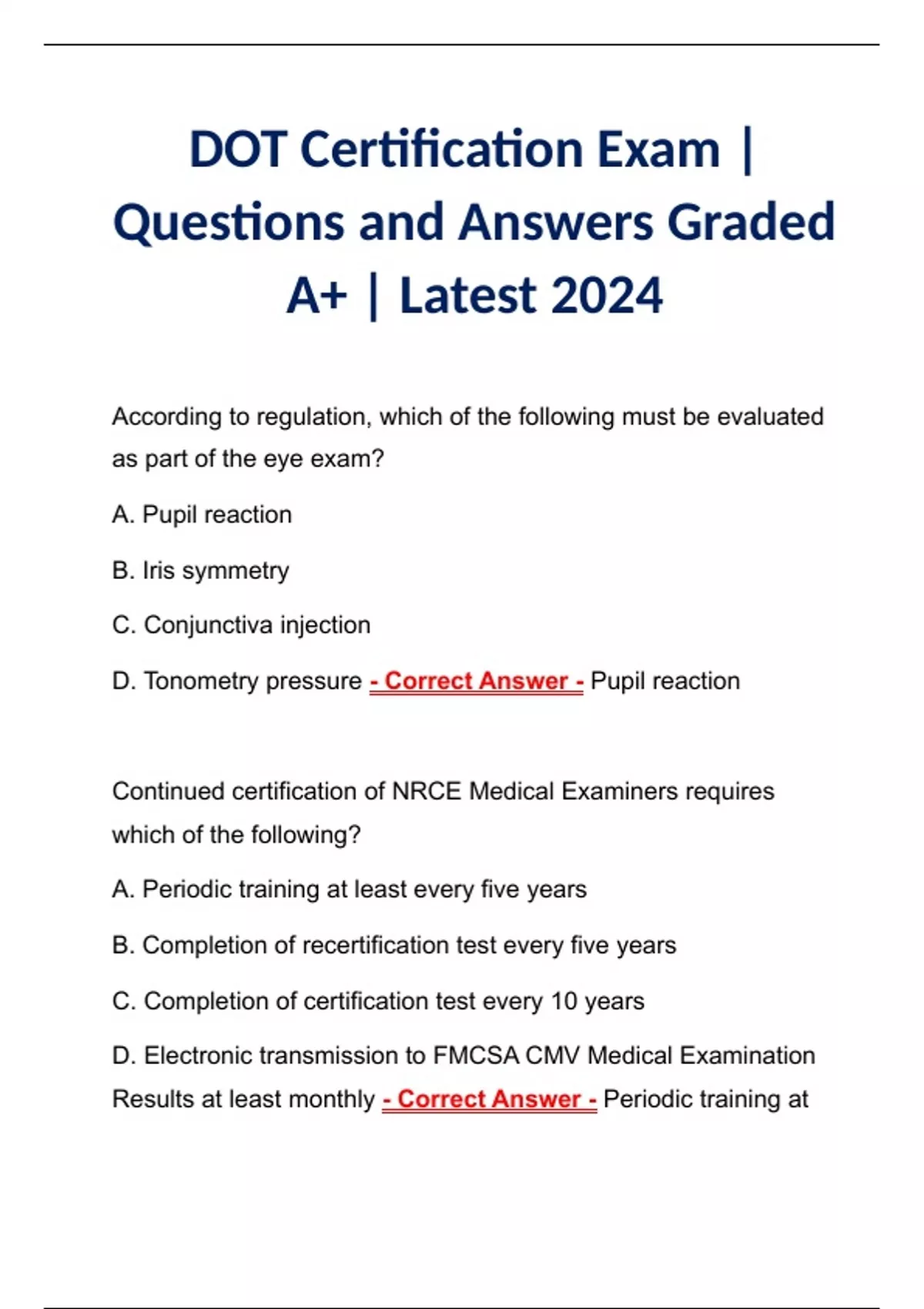 DOT Certification Exam | Questions and Answers Graded A+ | Latest 2024