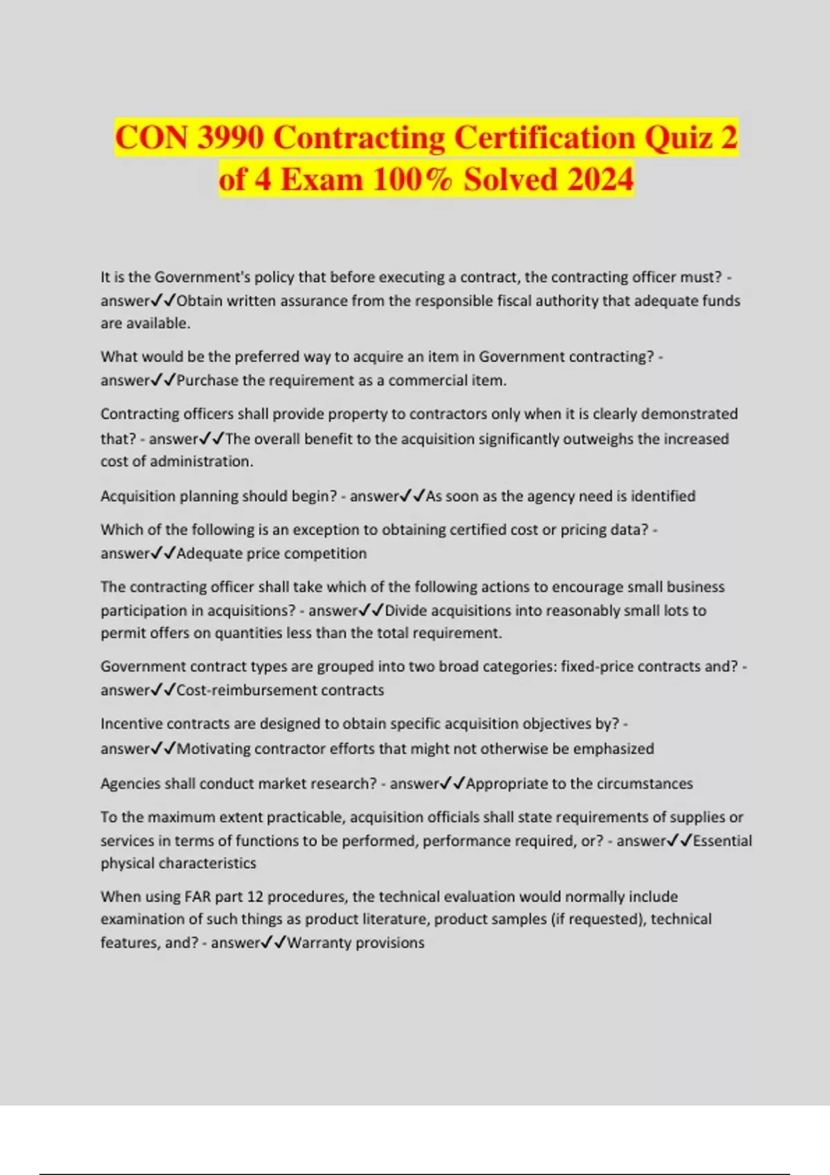 CON 3990 Contracting Certification Quiz 2 of 4 Exam 100% Solved 2024