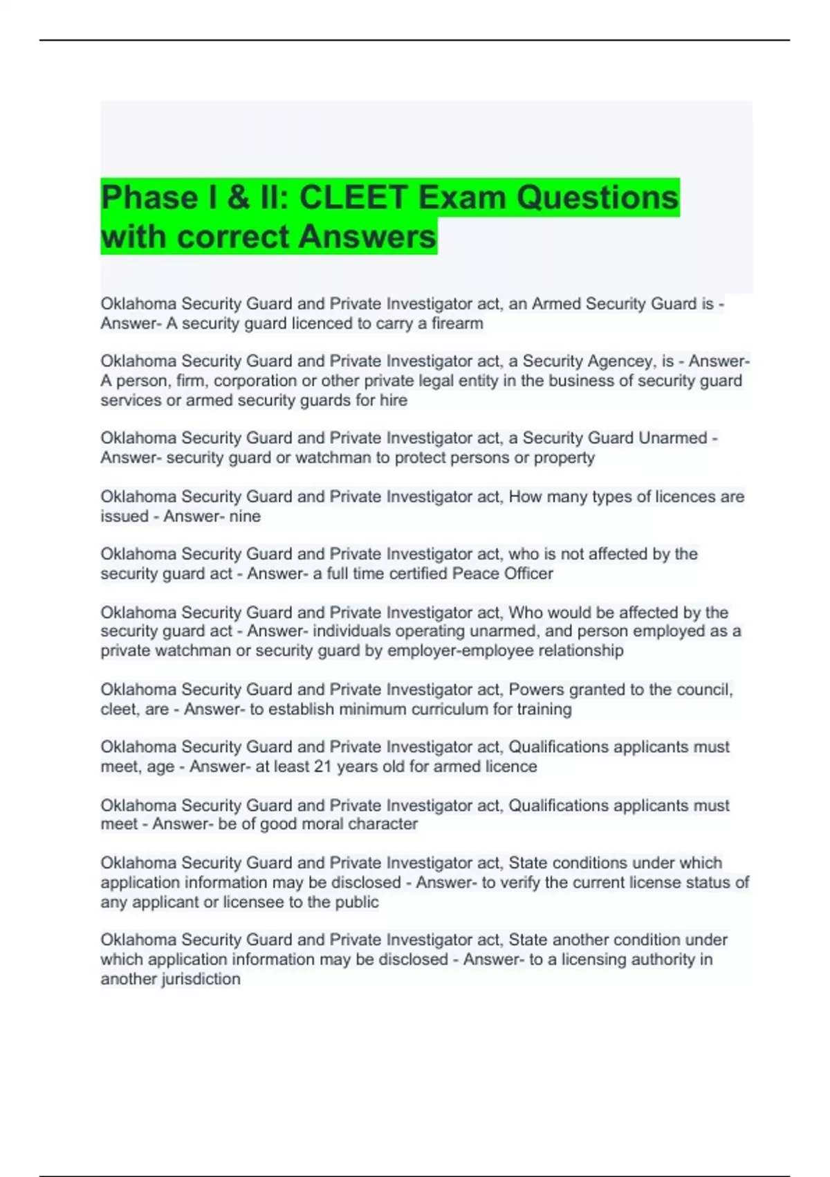 Phase I & II CLEET Exam Questions with correct Answers