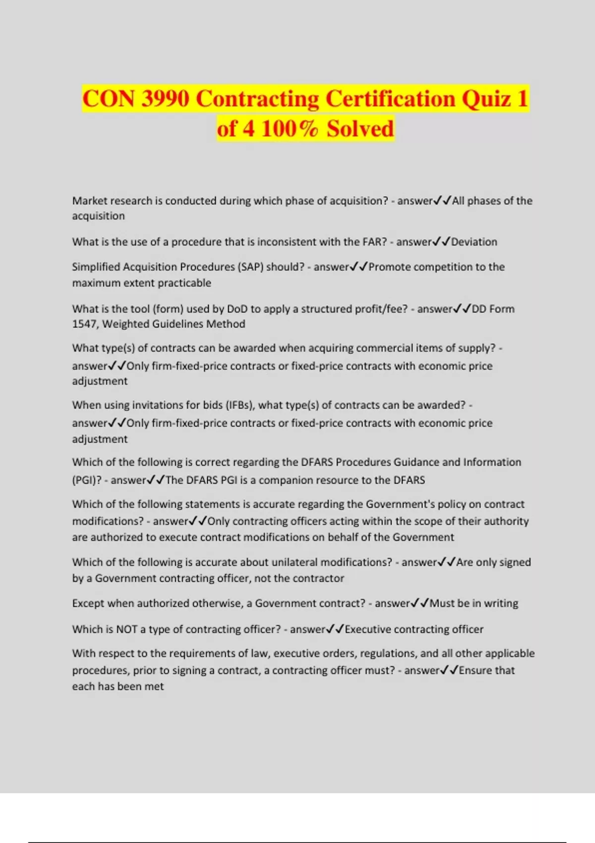 CON 3990 Contracting Certification Quiz 1 of 4 100% Solved Market research is conducted during which phase of acquisition? - answerAll phases of the acquisition What is the use of a procedure that is inconsistent with the FAR? - answerDeviation Simplified Acquisition Procedures (SAP) should? - answerPromote competition to the maximum extent practicable What is the tool (form) used by DoD to apply a structured profit/fee? - answerDD Form 1547, Weighted Guidelines Method What type(s) of contracts can be awarded when acquiring commercial items of supply? - answerOnly firm-fixed-price contracts or fixed-price contracts with economic price adjustment When using invitations for bids (IFBs), what type(s) of contracts can be awarded? - answerOnly firm-fixed-price contracts or fixed-price contracts with economic price adjustment Which of the following is correct regarding the DFARS Procedures Guidance and Information (PGI)? - answerThe DFARS PGI is a companion resource to the DFARS Which of the following statements is accurate regarding the Government's policy on contract modifications? - answerOnly contracting officers acting within the scope of their authority are authorized to execute contract modifications on behalf of the Government Which of the following is accurate about unilateral modifications? - answerAre only signed by a Government contracting officer, not the contractor Except when authorized otherwise, a Government contract? - answerMust be in writing Which is NOT a type of contracting officer? - answerExecutive contracting officer With respect to the requirements of law, executive orders, regulations, and all other applicable procedures, prior to signing a contract, a contracting officer must? - answerEnsure that each has been met