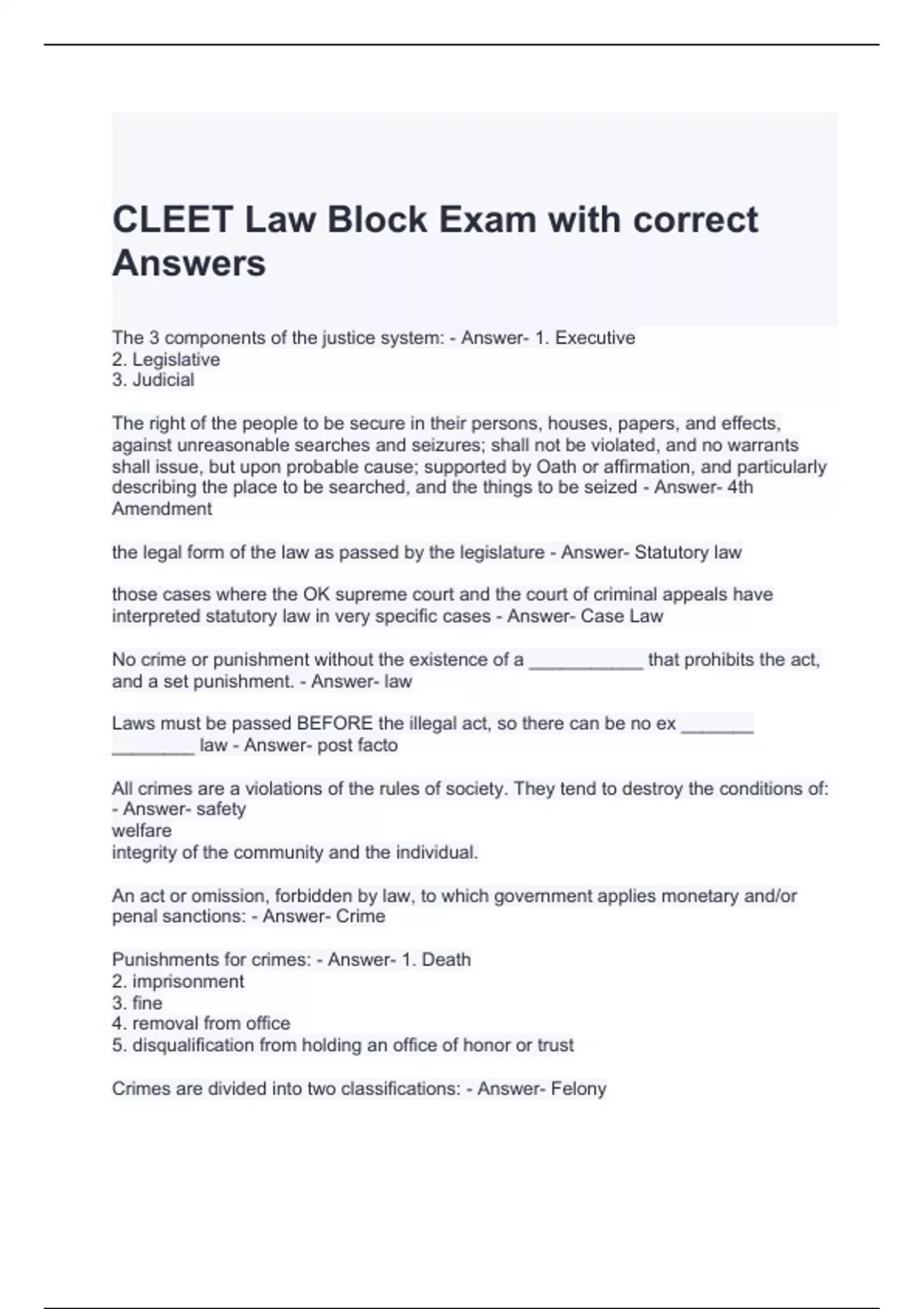 CLEET Law Block Exam with correct Answers 100%