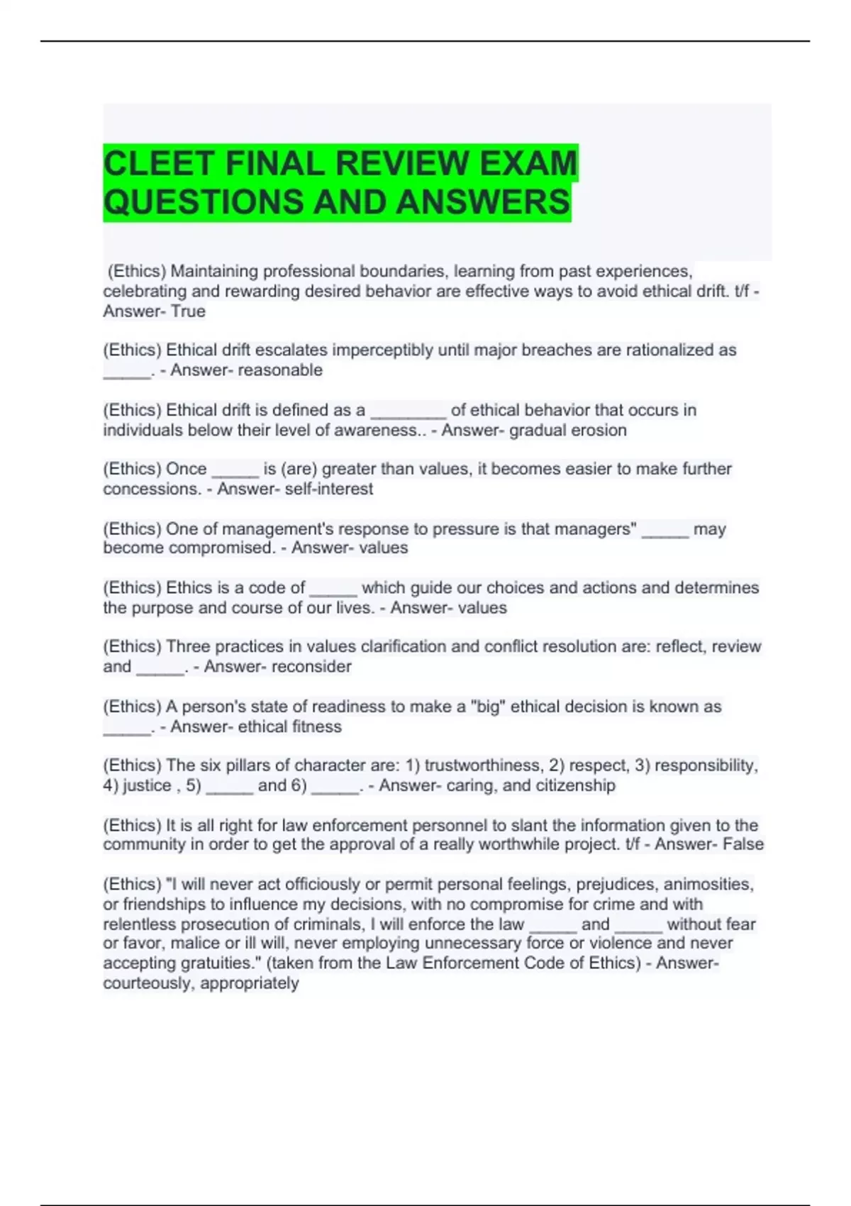 CLEET FINAL REVIEW EXAM QUESTIONS AND ANSWERS 100% CORRECT