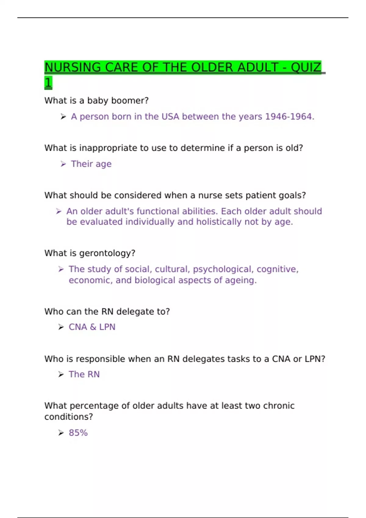 NURSING CARE OF THE OLDER ADULT - QUIZ 1