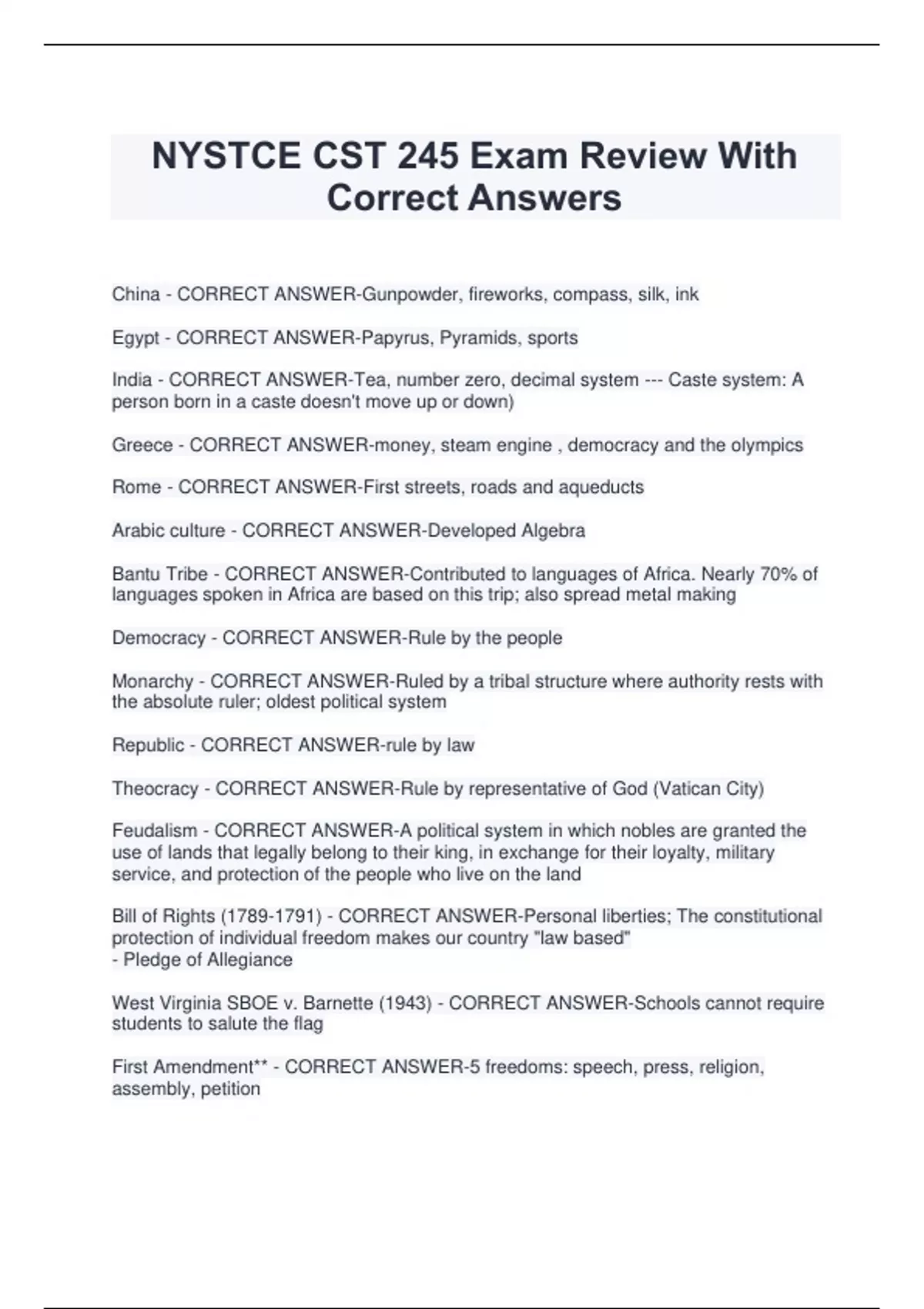 NYSTCE CST 245 Exam Review With Correct Answers China - CORRECT ANSWER-Gunpowder, fireworks, compass, silk, ink Egypt - CORRECT ANSWER-Papyrus, Pyramids, sports India - CORRECT ANSWER-Tea, number zero, decimal system --- Caste system: A person born in a caste doesn't move up or down) Greece - CORRECT ANSWER-money, steam engine , democracy and the olympics Rome - CORRECT ANSWER-First streets, roads and aqueducts Arabic culture - CORRECT ANSWER-Developed Algebra Bantu Tribe - CORRECT ANSWER-Contributed to languages of Africa. Nearly 70% of languages spoken in Africa are based on this trip; also spread metal making Democracy - CORRECT ANSWER-Rule by the people Monarchy - CORRECT ANSWER-Ruled by a tribal structure where authority rests with the absolute ruler; oldest political system Republic - CORRECT ANSWER-rule by law Theocracy - CORRECT ANSWER-Rule by representative of God (Vatican City) Feudalism - CORRECT ANSWER-A political system in which nobles are granted the use of lands that legally belong to their king, in exchange for their loyalty, military service, and protection of the people who live on the land Bill of Rights () - CORRECT ANSWER-Personal liberties; The constitutional protection of individual freedom makes our country "law based" - Pledge of Allegiance West Virginia SBOE v. Barnette (1943) - CORRECT ANSWER-Schools cannot require students to salute the flag First Amendment** - CORRECT ANSWER-5 freedoms: speech, press, religion, assembly, petition