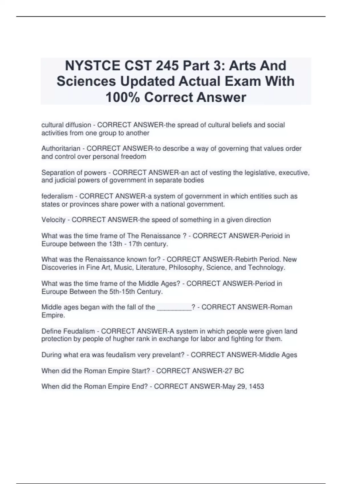 NYSTCE CST 245 Part 3: Arts And Sciences Updated Actual Exam With 100% Correct Answer cultural diffusion - CORRECT ANSWER-the spread of cultural beliefs and social activities from one group to another Authoritarian - CORRECT ANSWER-to describe a way of governing that values order and control over personal freedom Separation of powers - CORRECT ANSWER-an act of vesting the legislative, executive, and judicial powers of government in separate bodies federalism - CORRECT ANSWER-a system of government in which entities such as states or provinces share power with a national government. Velocity - CORRECT ANSWER-the speed of something in a given direction What was the time frame of The Renaissance ? - CORRECT ANSWER-Perioid in Euroupe between the 13th - 17th century. What was the Renaissance known for? - CORRECT ANSWER-Rebirth Period. New Discoveries in Fine Art, Music, Literature, Philosophy, Science, and Technology. What was the time frame of the Middle Ages? - CORRECT ANSWER-Period in Euroupe Between the 5th-15th Century. Middle ages began with the fall of the _________? - CORRECT ANSWER-Roman Empire. Define Feudalism - CORRECT ANSWER-A system in which people were given land protection by people of hugher rank in exchange for labor and fighting for them. During what era was feudalism very prevelant? - CORRECT ANSWER-Middle Ages When did the Roman Empire Start? - CORRECT ANSWER-27 BC When did the Roman Empire End? - CORRECT ANSWER-May 29, 1453