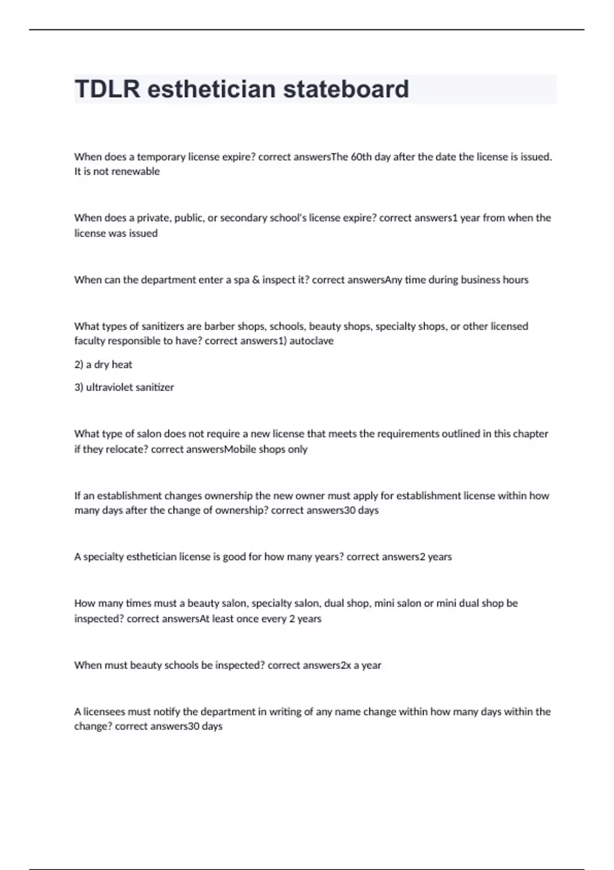 How many times must a beauty salon, specialty salon, dual shop, mini salon or mini dual shop be inspected? correct answersAt least once every 2 years